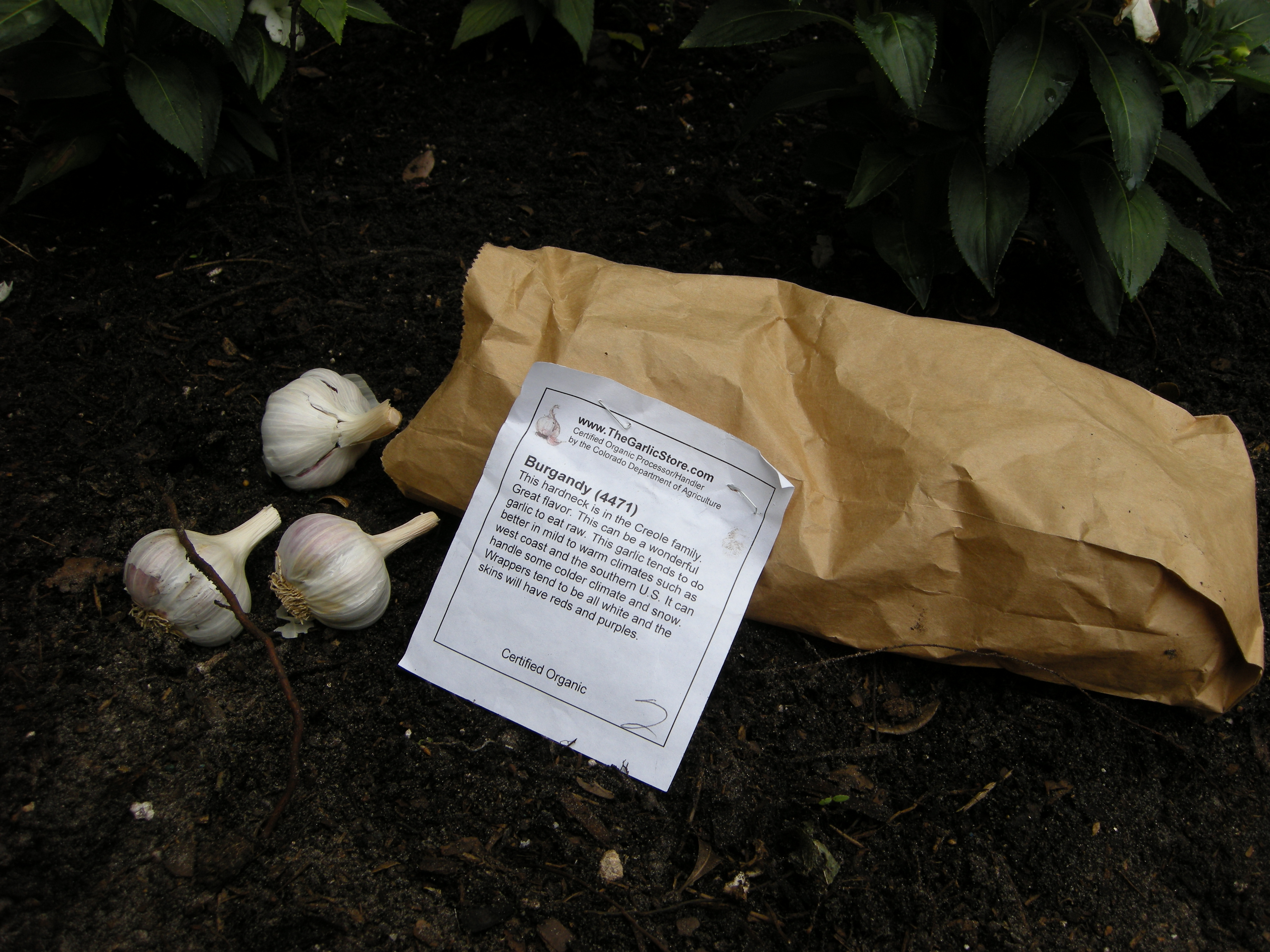 This afternoon I broke up some bulbs of planting garlic named Burgundy and poked the cloves between the New Guinea Impatiens in the front yard.