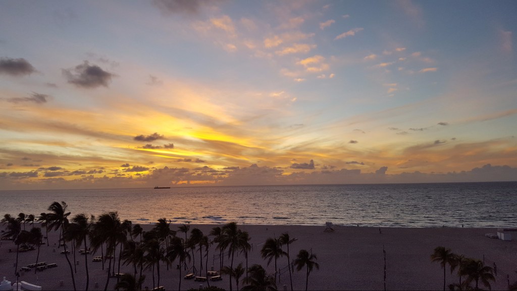Sunrise over the Atlantic ocean.Standing room only audience of over 150 people from around the state.Wendell Butler Award and other plaques to recognize award winners.View from the 7th floor of the B Ocean Resort, Fort Lauderdale.Crab races at the Hospitality Suite.Phil Buck, President, Royal Palm Chapter gives $2000.00 donation to the University of Florida toward research.Four other chapters donated too. Dr. Jack Payne gives us an update about funding cuts.