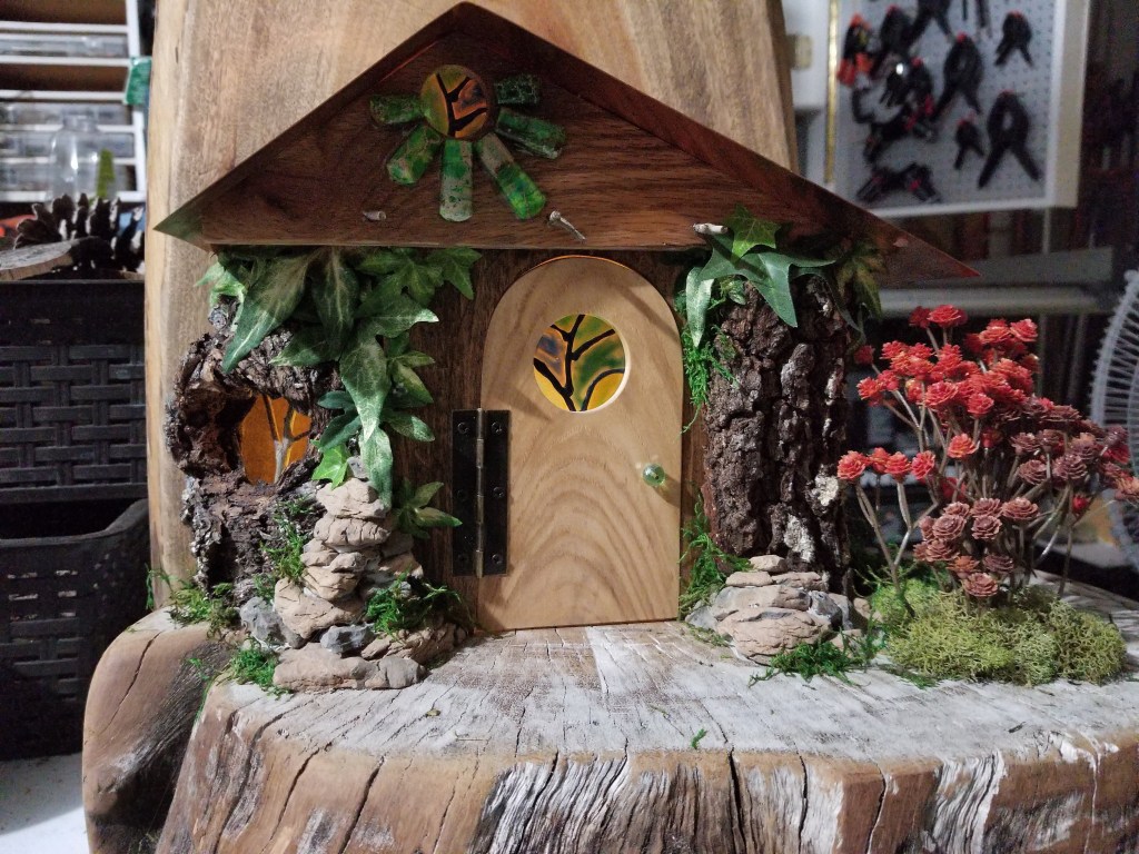 Here is my latest project: A “fairy house” with a copper roof surrounded with lots of wood. We mounted it outdoors as a welcome by our front door.
