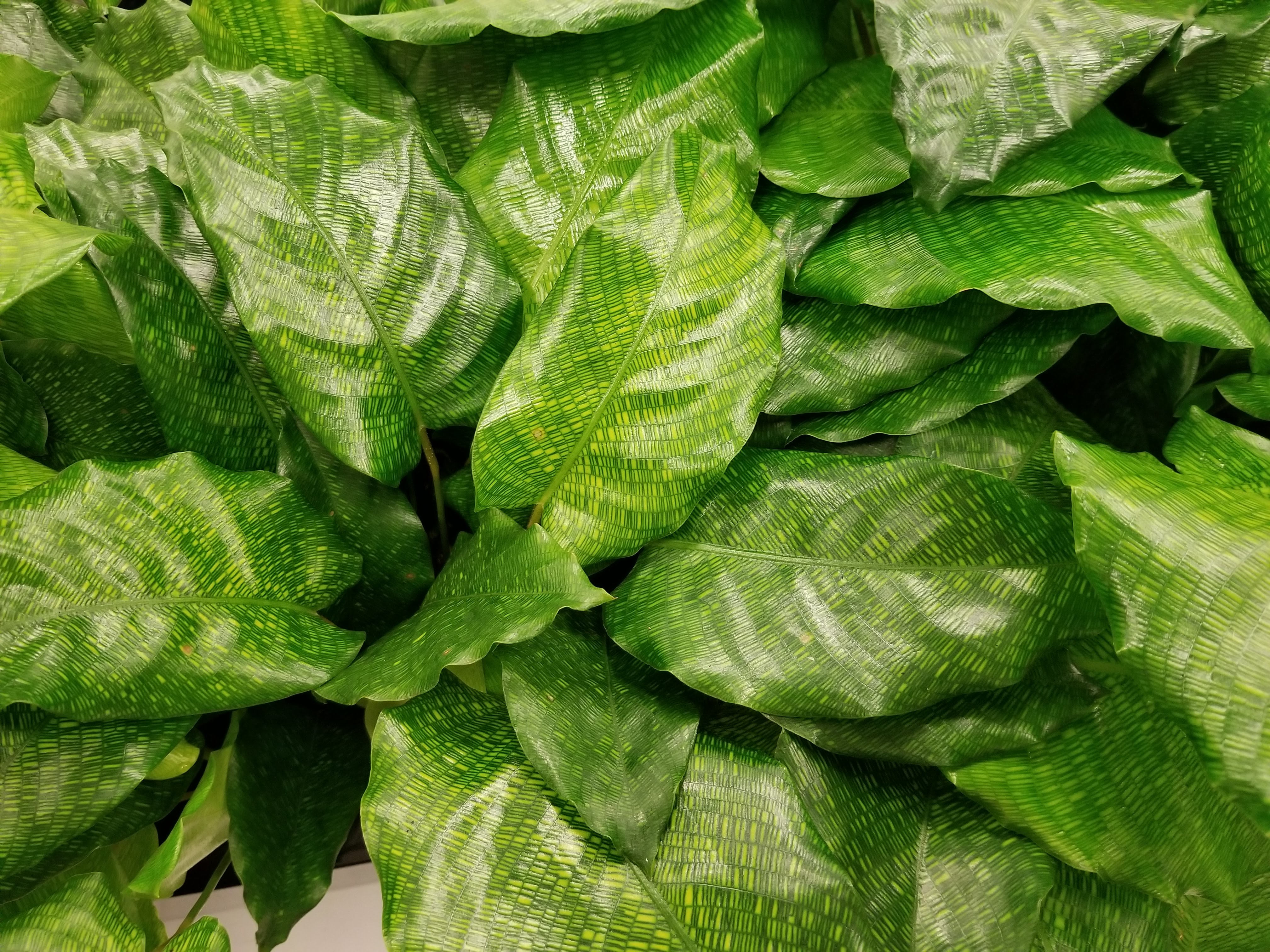 No leaf shine here: This orange Anthurium is naturally glossy.