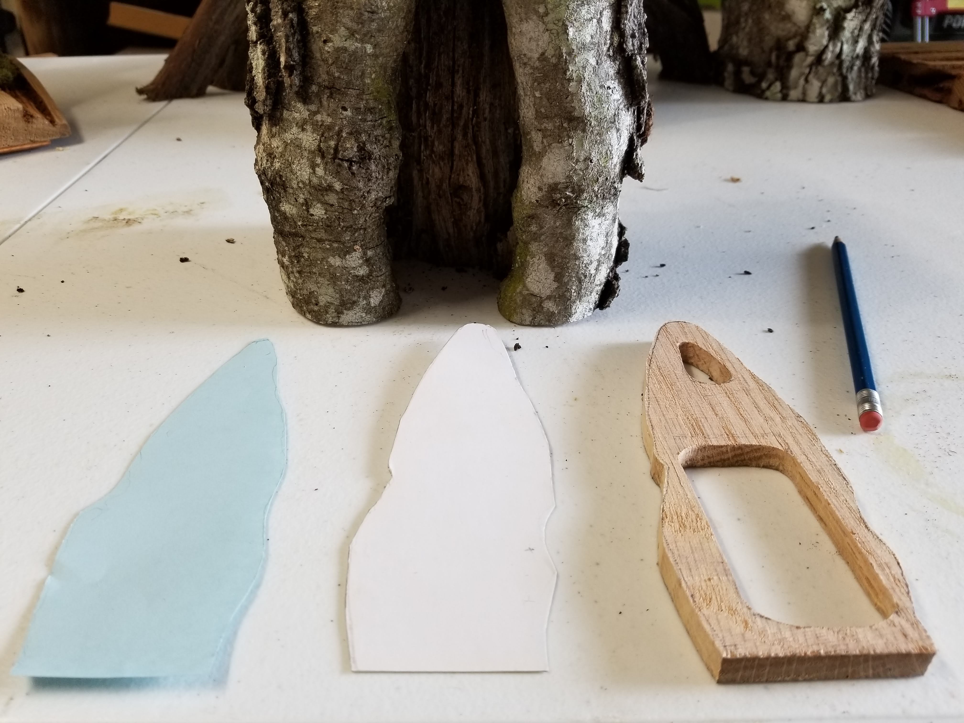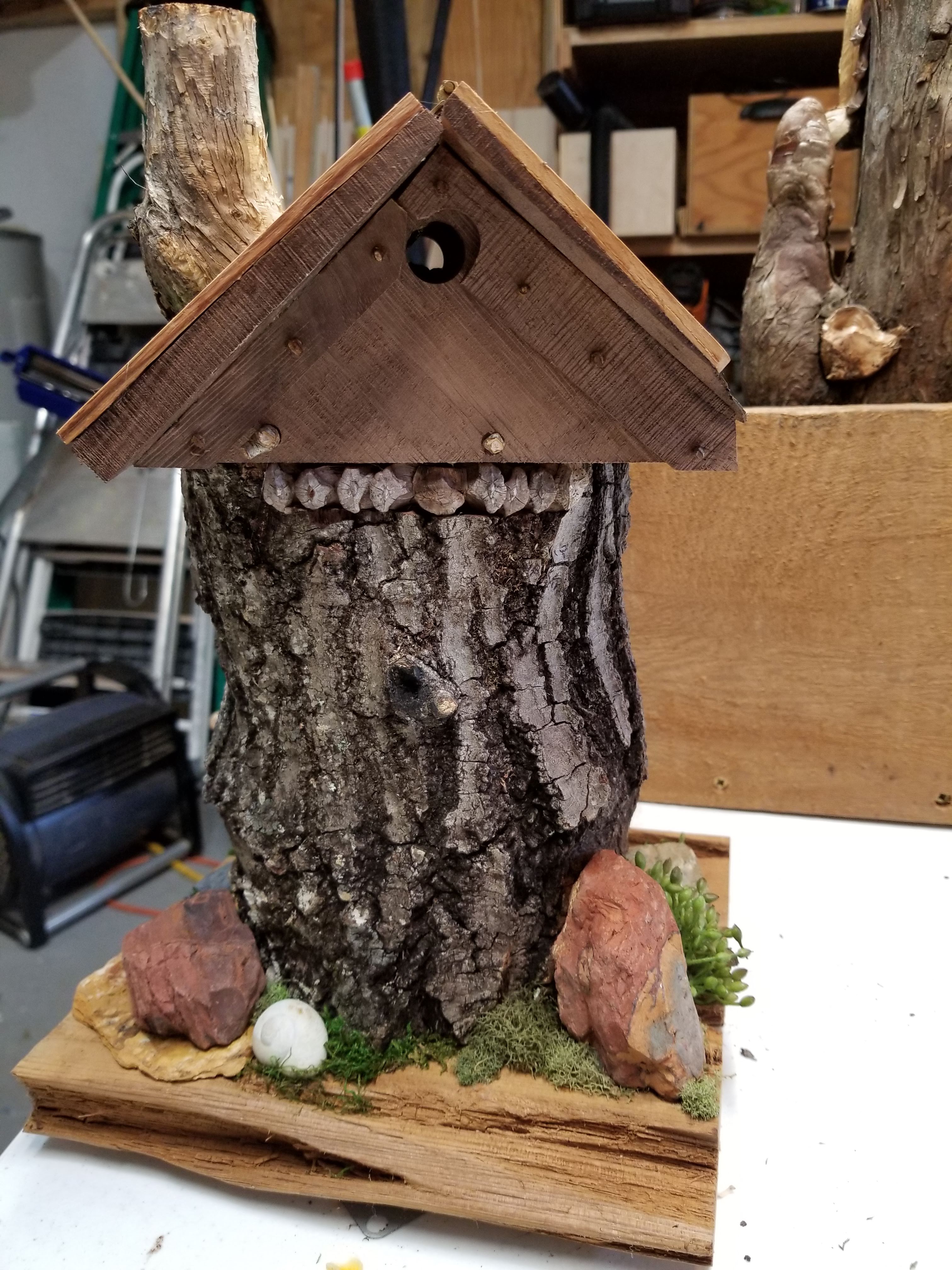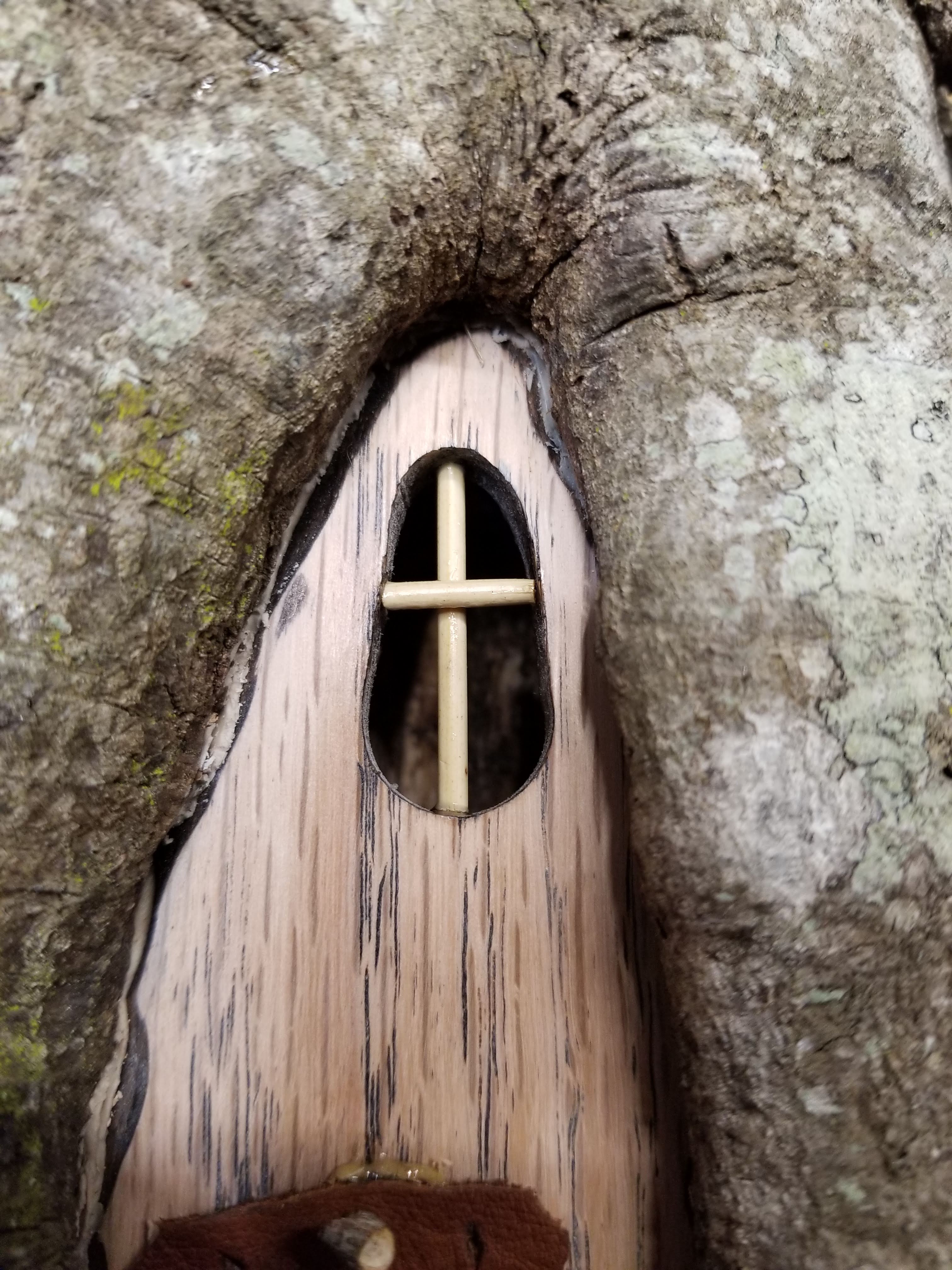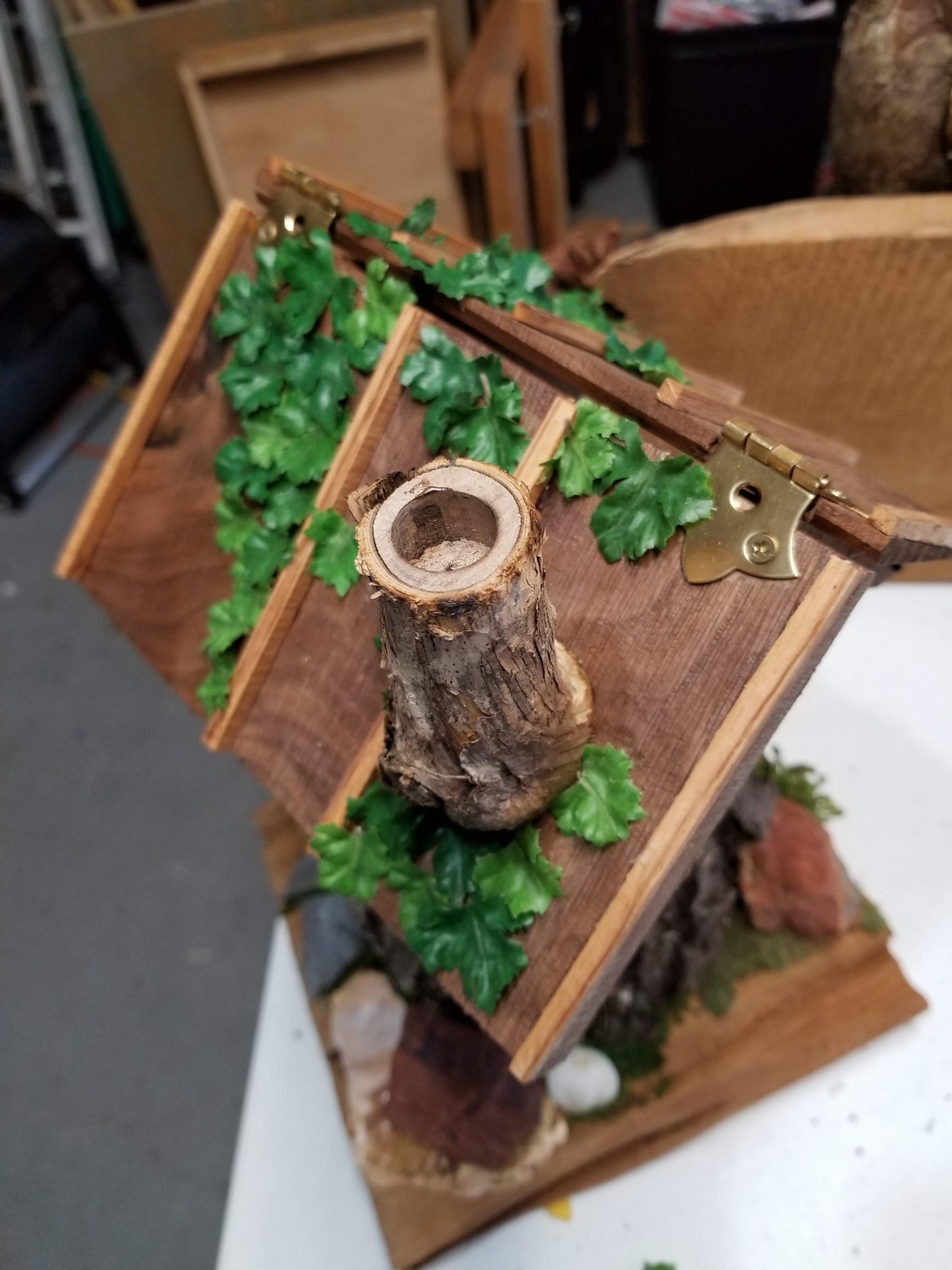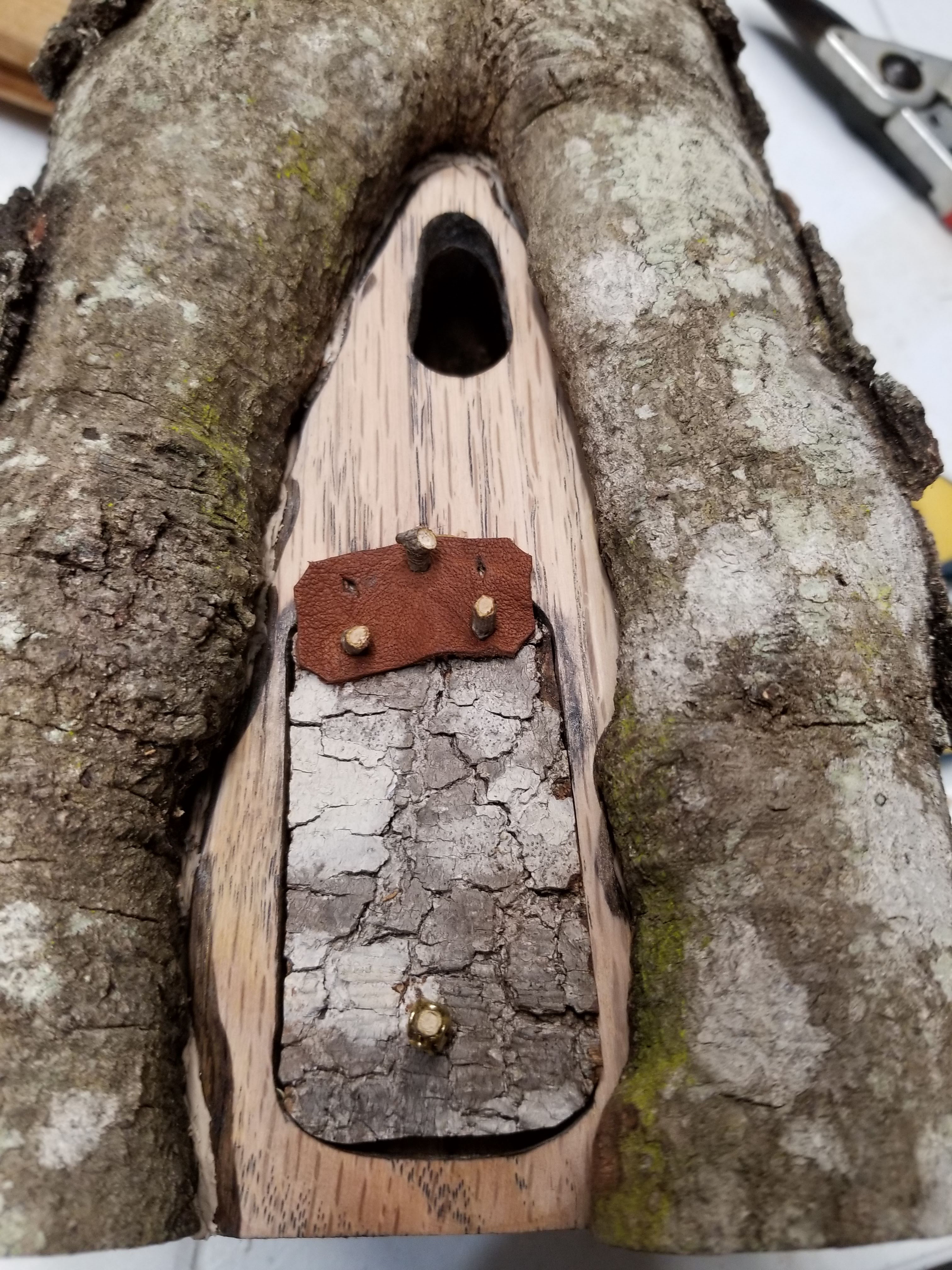 Thanks to my friend Jeff for letting me scavenge this hollow log from his firewood pile. It has a perfect, natural opening for an entrance. I carved the door from a slab of oak bark. I used a strap of leather for the hinge and pegged it with oak twigs, epoxied into holes.