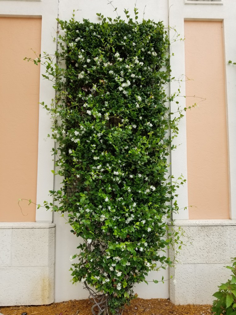 Confederate Jasmine is a vining plant that can be used as a ground cover or trained to climb a trellis or a fence. It has twining tendrils that actively reach out for the next object to wrap around.