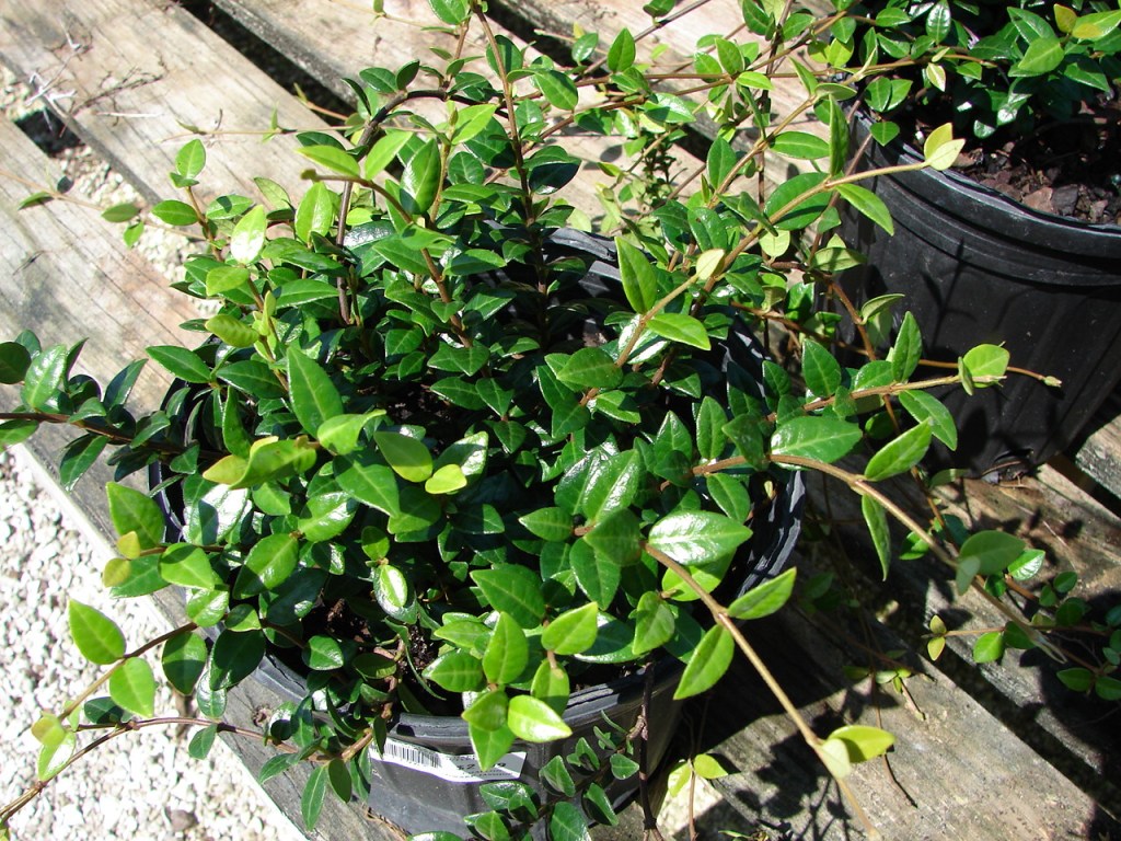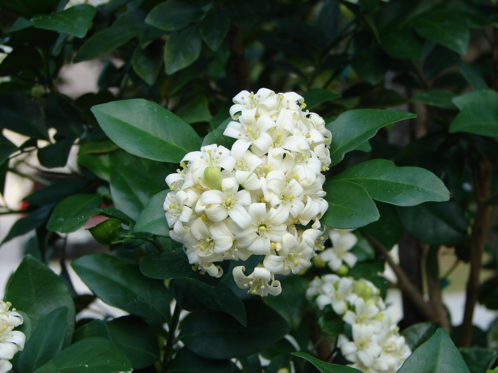 The Orange Jasmine (Murraya paniculata) earns it’s name by smelling very much like a citrus blossom. No wonder, they are in the same family (Rutacea). This upright shrub has medium green, compound leaves and is often used as a blooming hedge or trained as a tree form. An improved variety ‘Lakeview’ has deep green leaves and a more compact form. Orange Jasmine’s use is discouraged because it can host an insect (psyllid) that could transmit diseases to citrus trees.