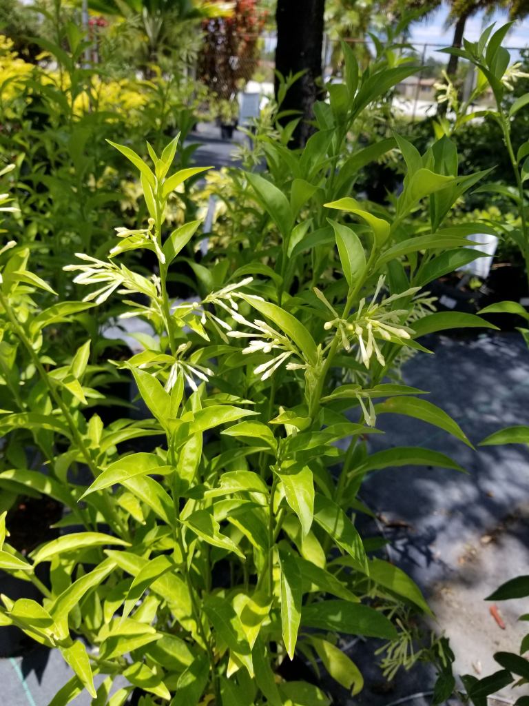 The Night Blooming Jasmine is an upright shrub whose small flowers pack a large fragrance. One shrub is enough to impart perfume to a backyard. Watch for leaf-chewing caterpillars who also work at night.