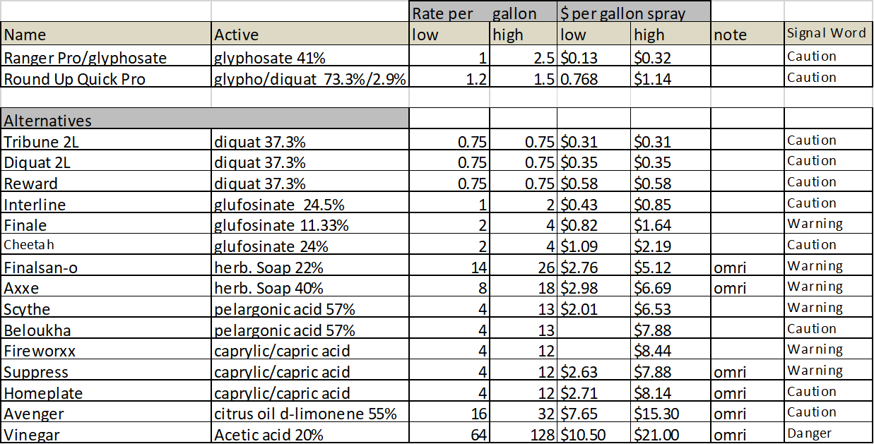 These are non-selective herbicides used in the landscape. Roundup is the only one on the list that is truly systemic and kills roots-and-all of weeds and grasses. All the alternatives are top-burners. I have tried them all and they do what they claim. Note the higher rates and prices. So, if a landscape maintenance company switches from Ranger to organic Axxe, they would be paying 20 times more per gallon of finished spray.