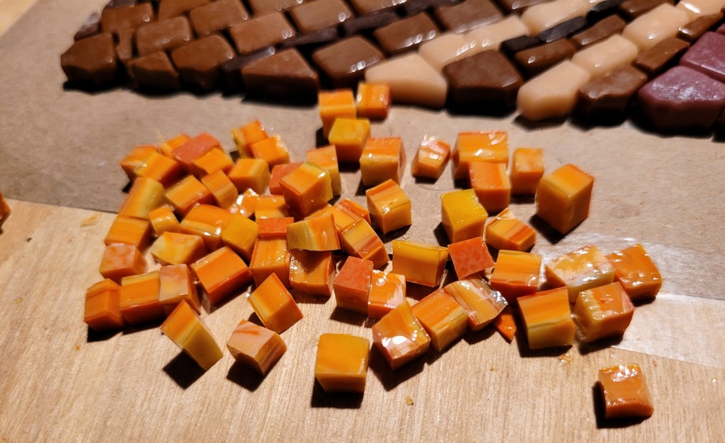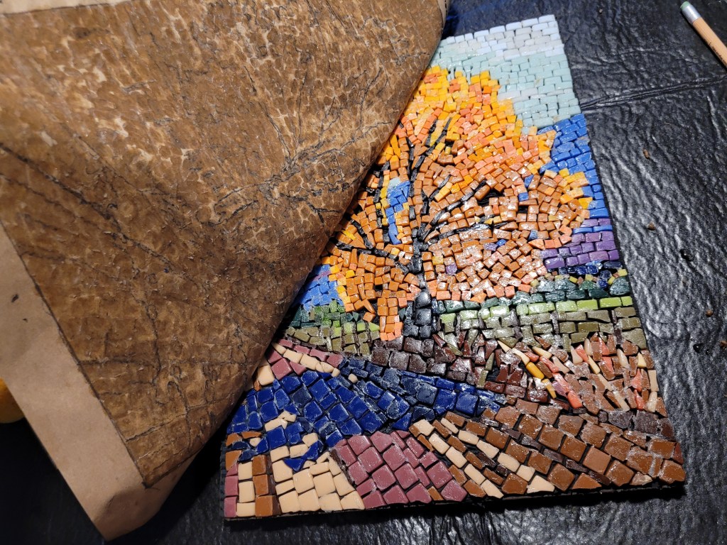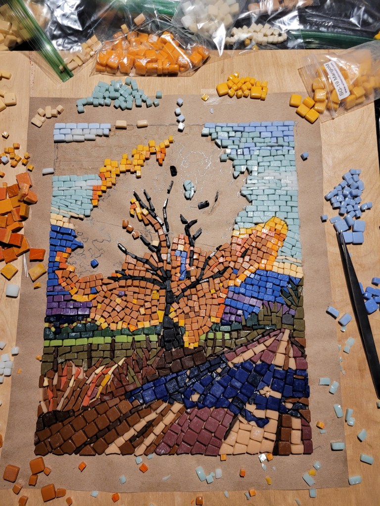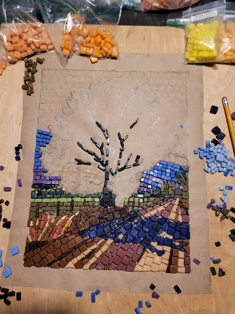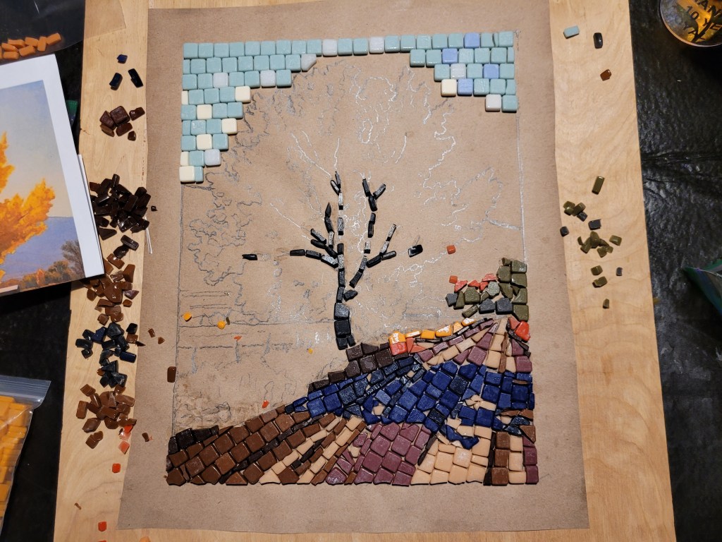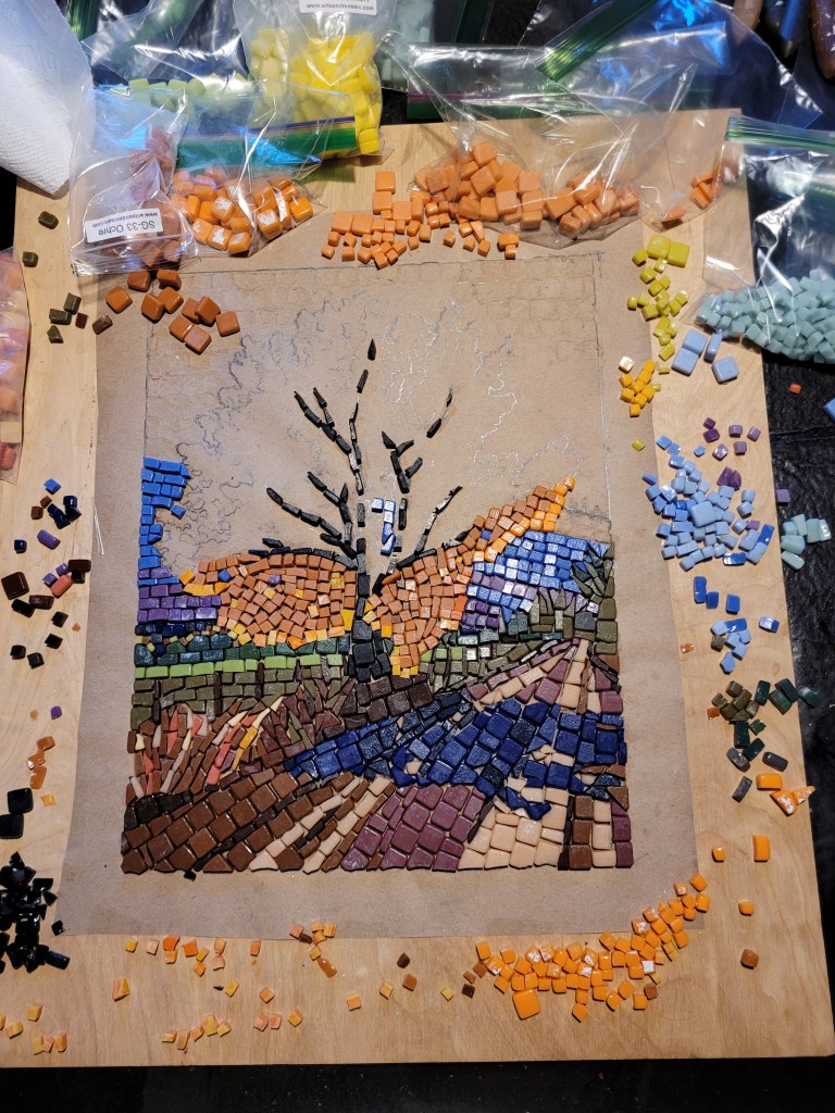 I’m just getting started at making mosaics, an art form I’ve always admired. My wife and I took a one-night class at making mosaics out of glass so we could learn the basics of handling tools, cutting, and setting. Then I took an online class through Domestica, “Introduction to Mosaic Artwork” by Gary Drostle.