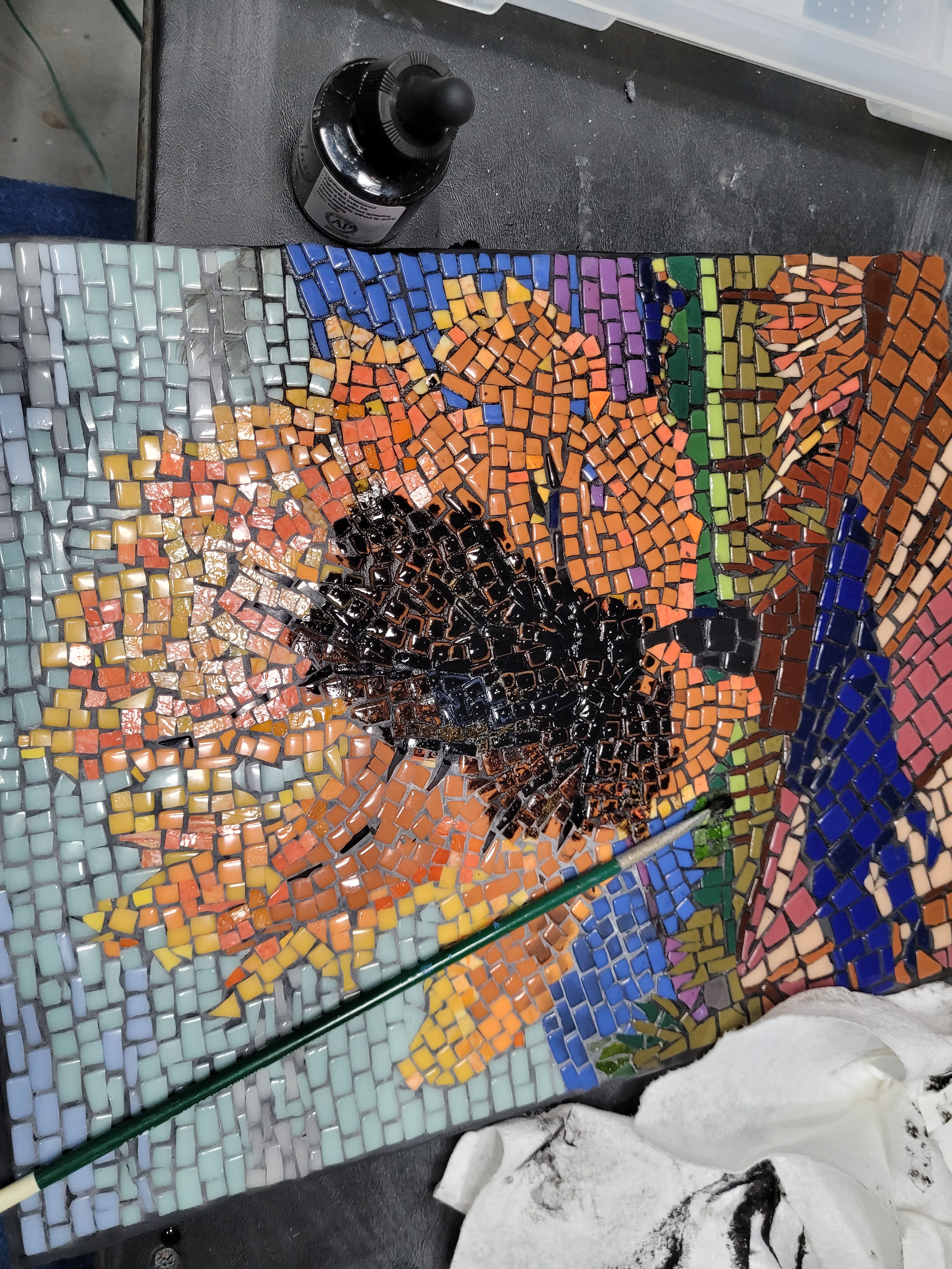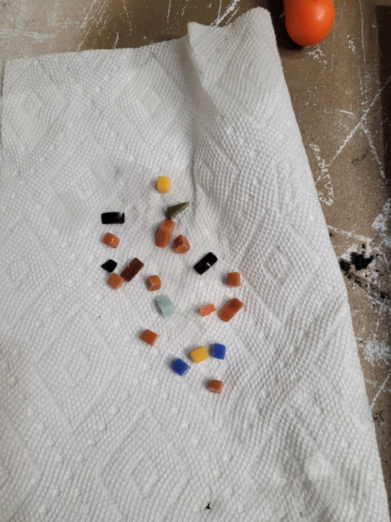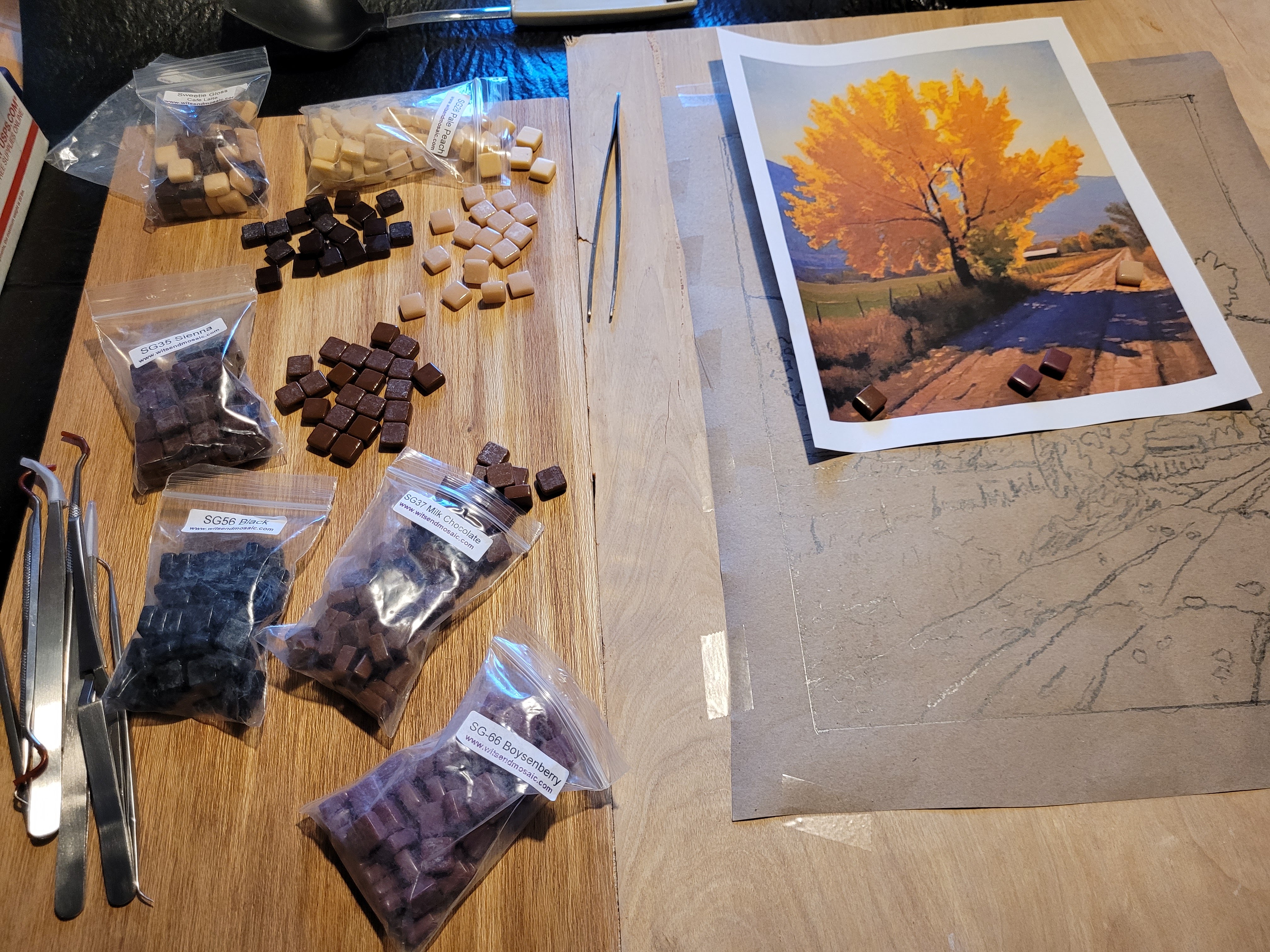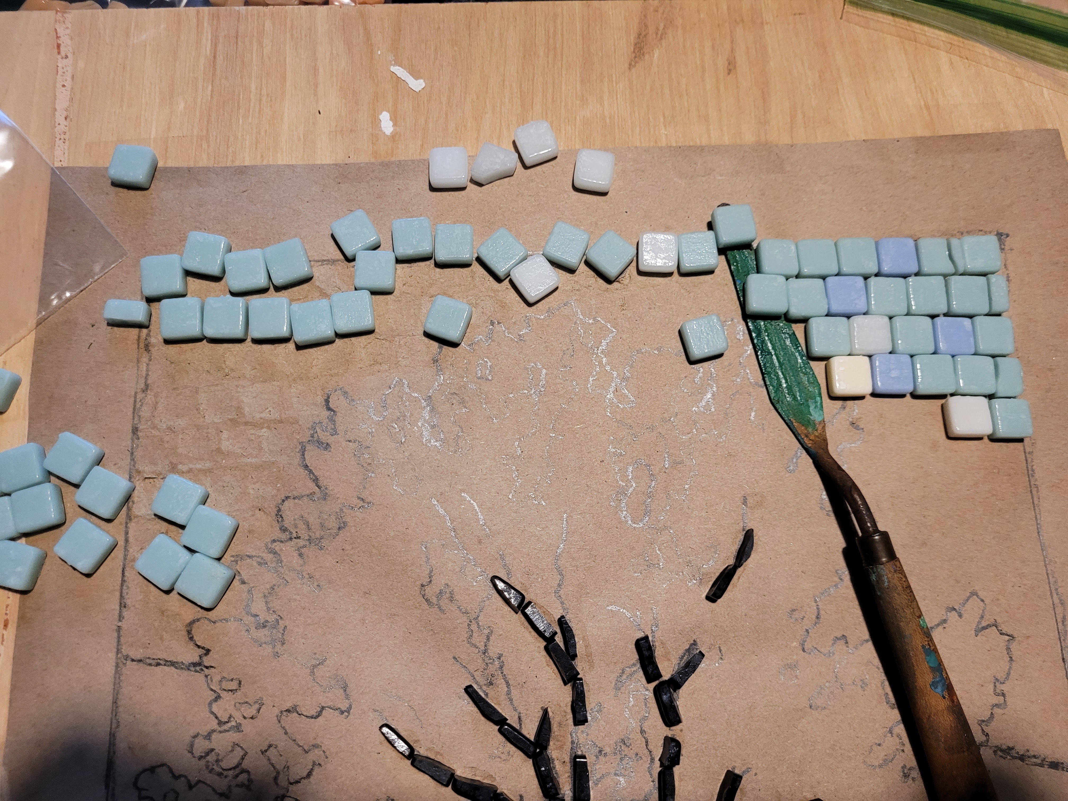 I’m just getting started at making mosaics, an art form I’ve always admired. My wife and I took a one-night class at making mosaics out of glass so we could learn the basics of handling tools, cutting, and setting. Then I took an online class through Domestica, “Introduction to Mosaic Artwork” by Gary Drostle.