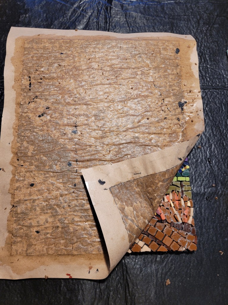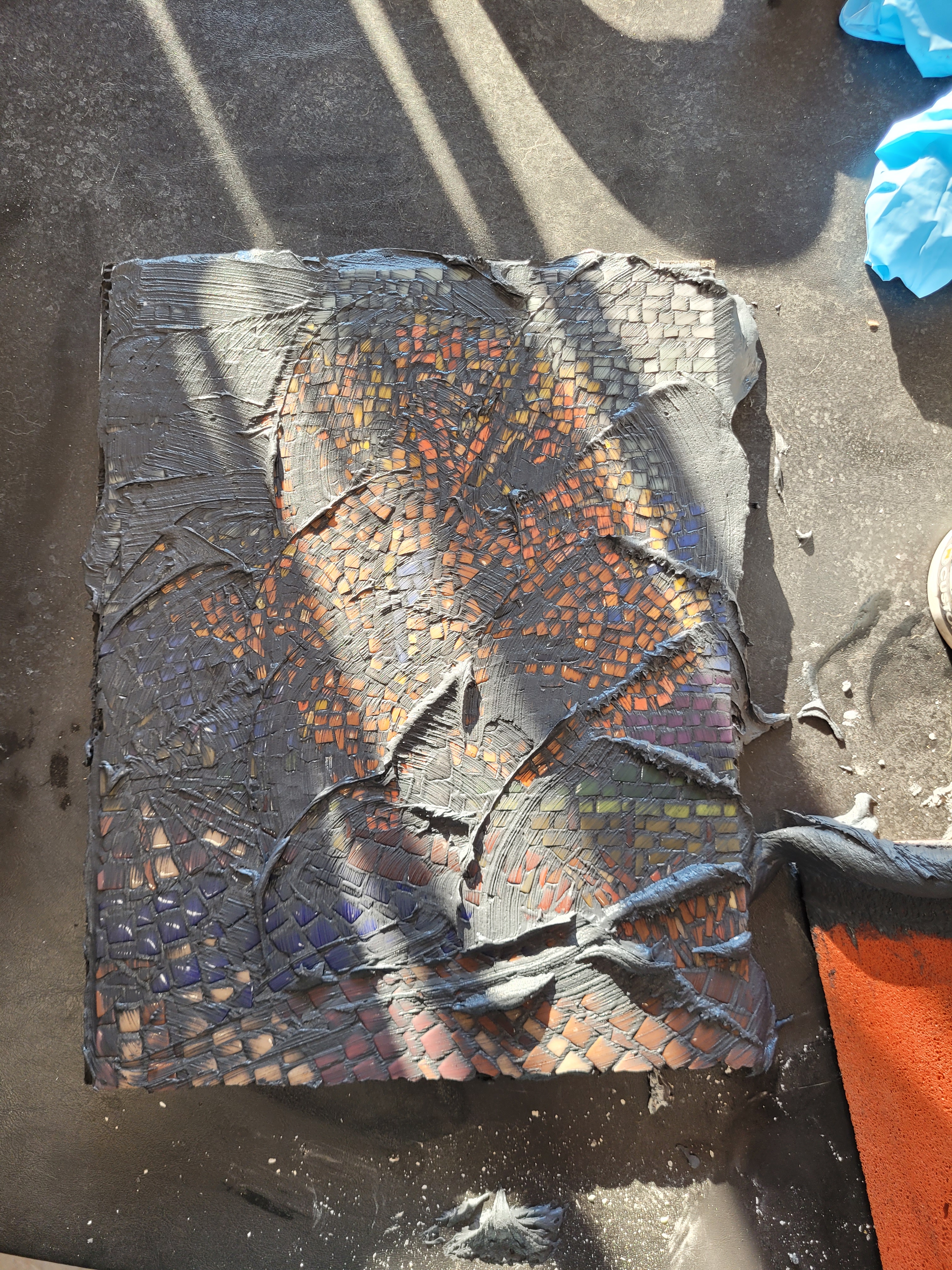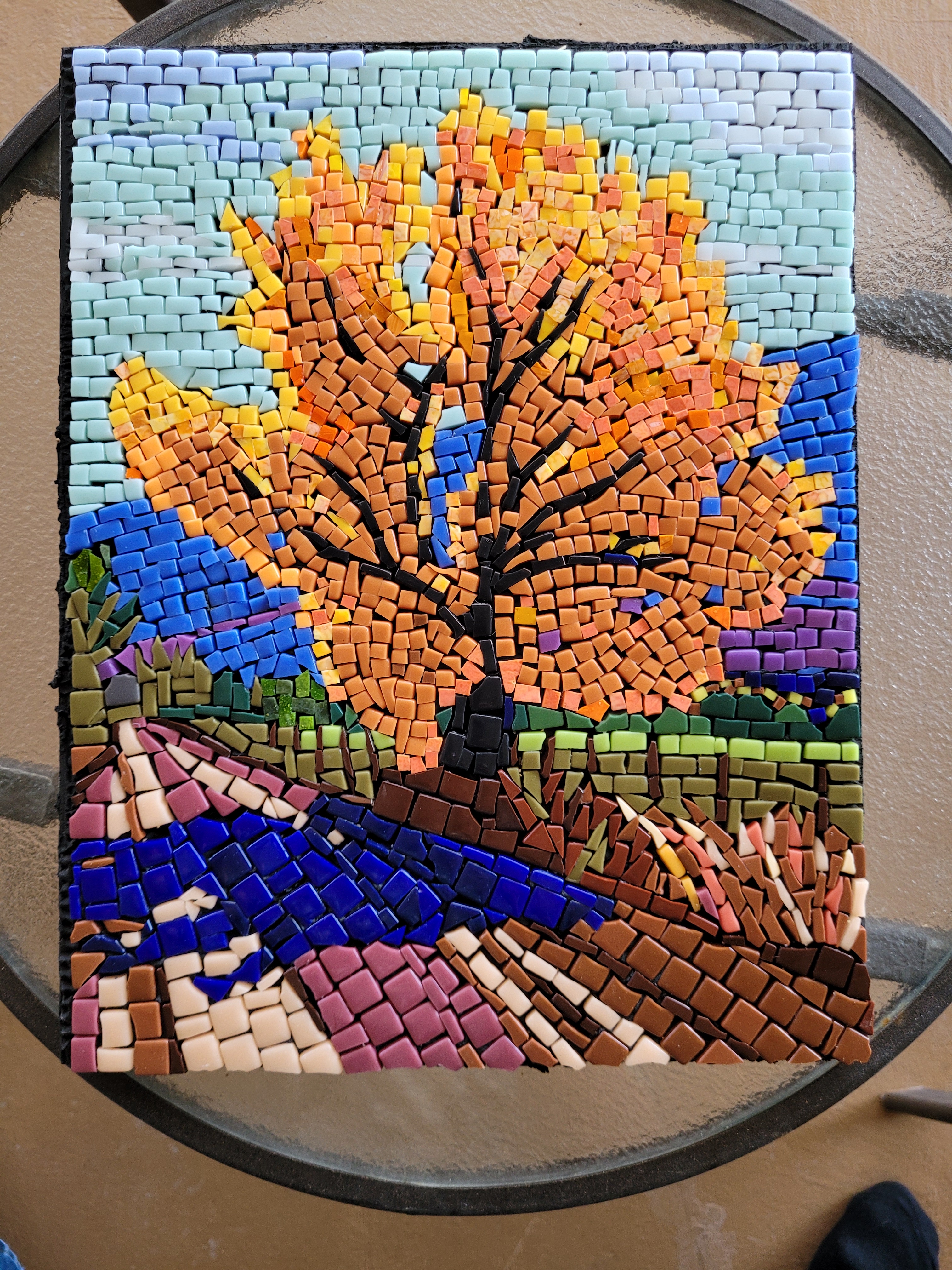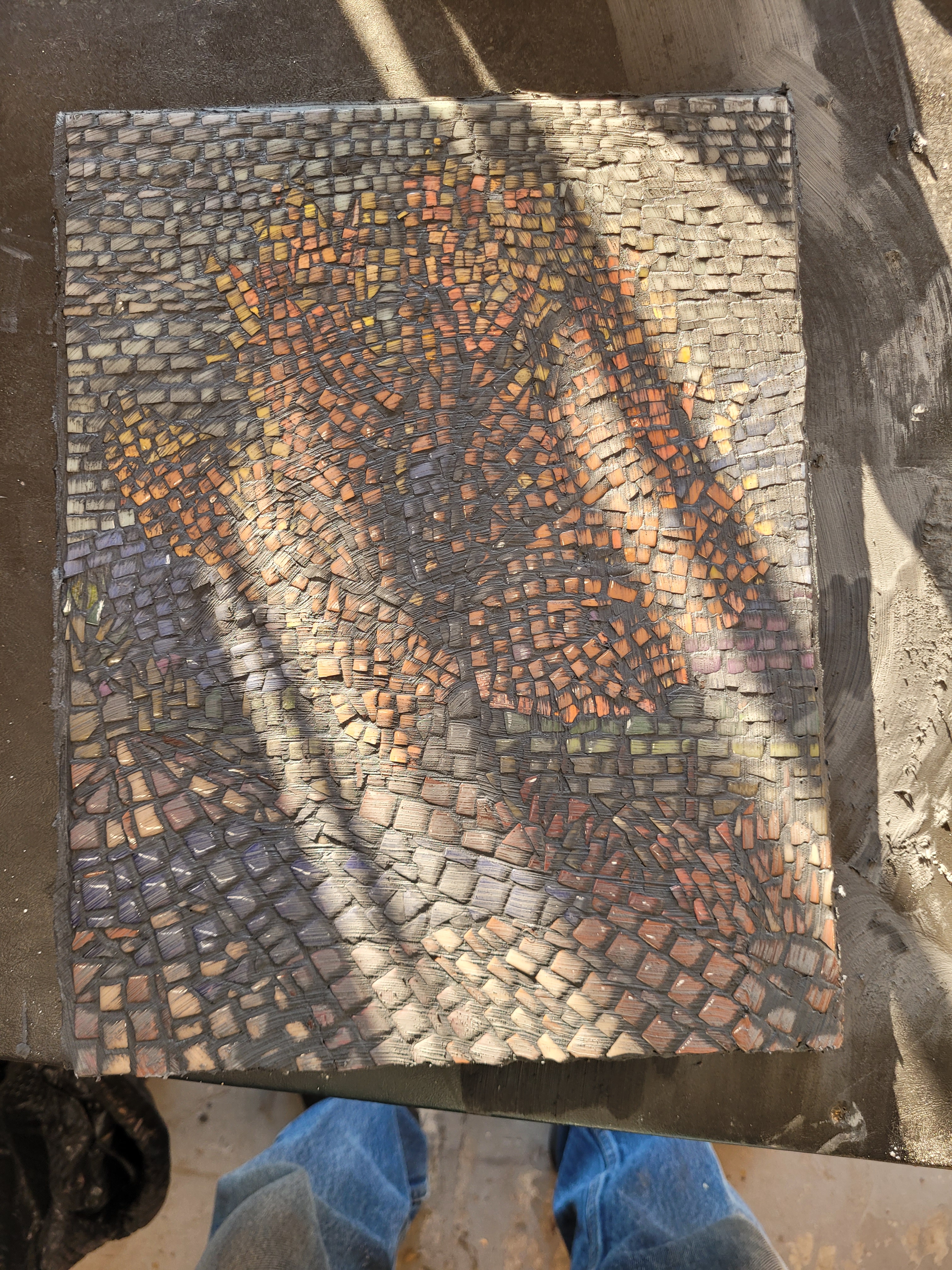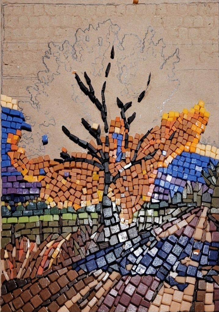 In this second creation I violated many rules of good mosaic making. The spacing between pieces is too close and there is no well-defined pattern in the leaves, but elsewhere. But it is a learning exercize that will make the next one better.