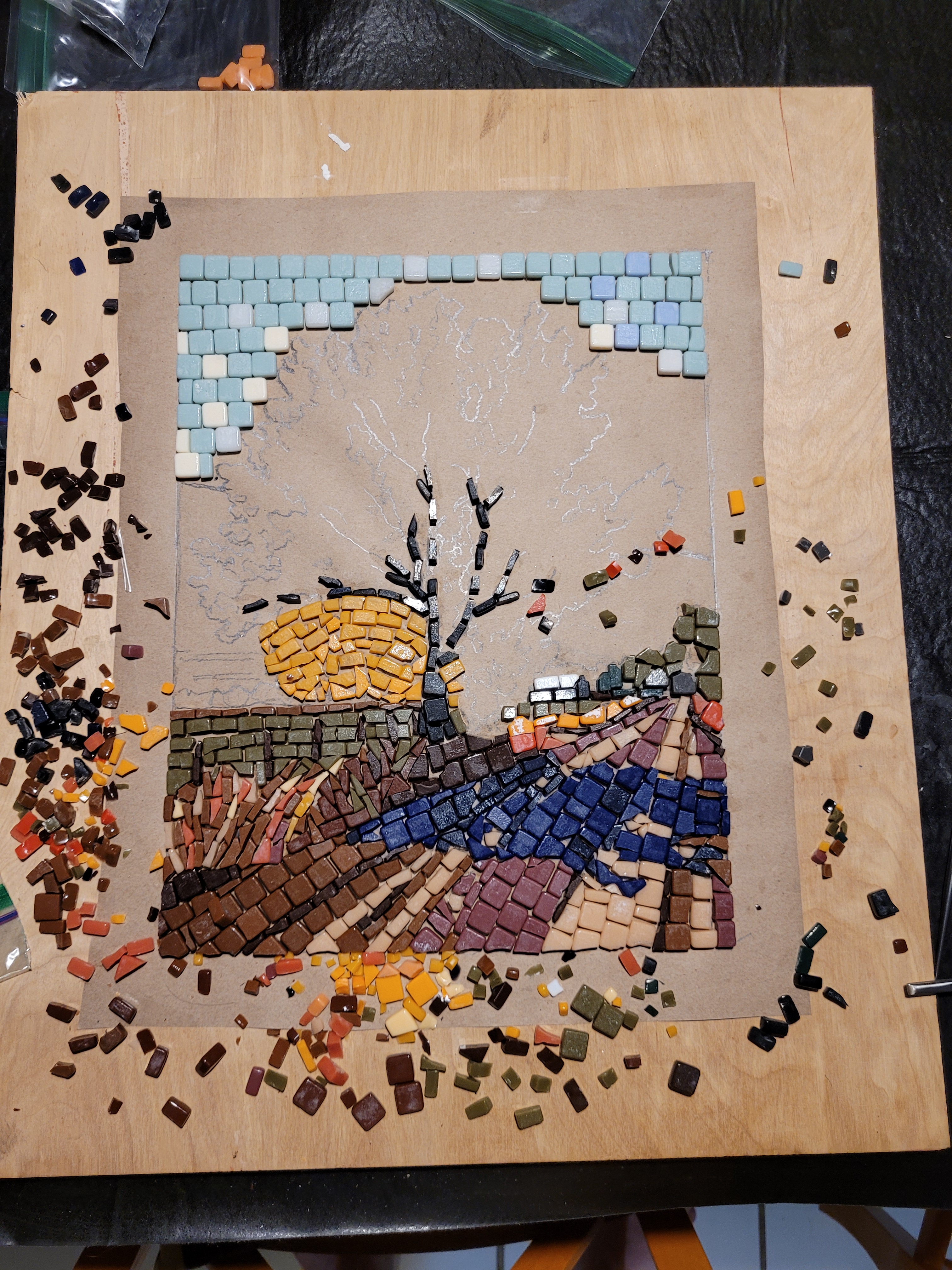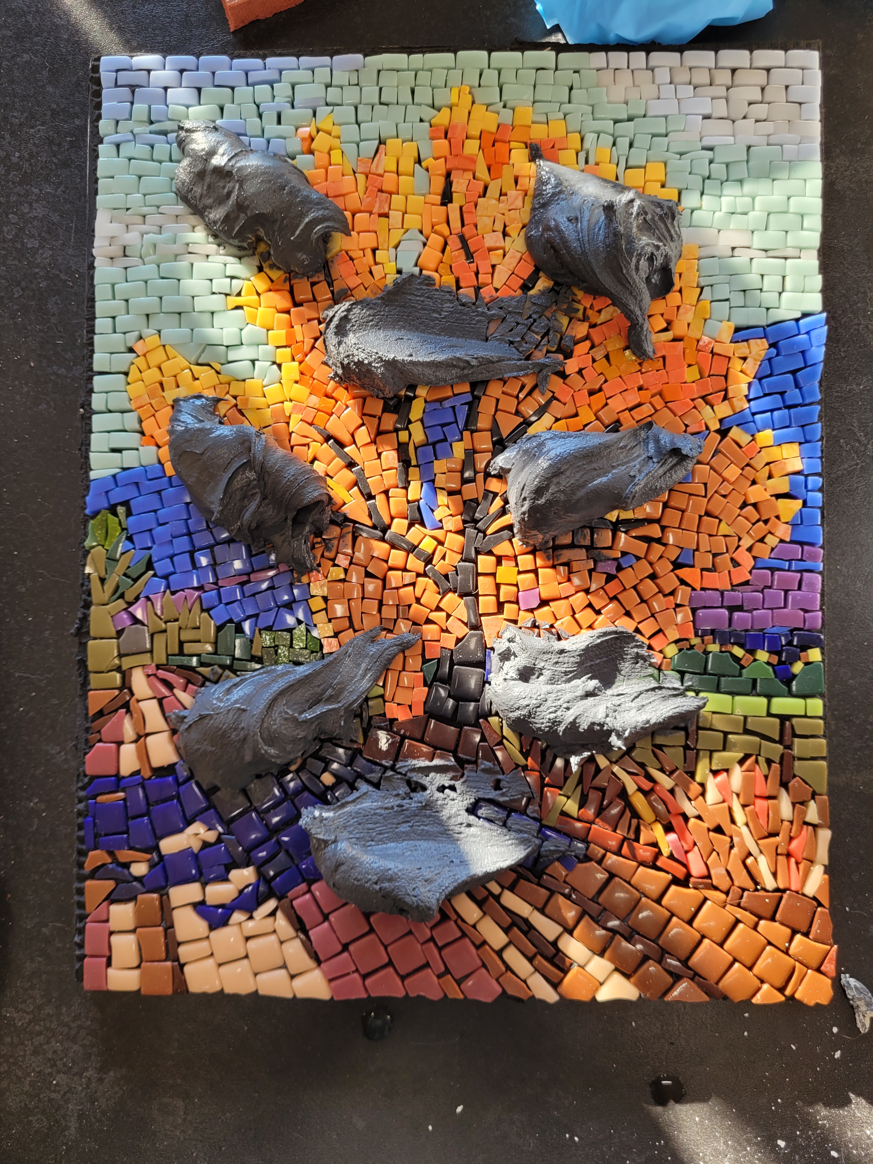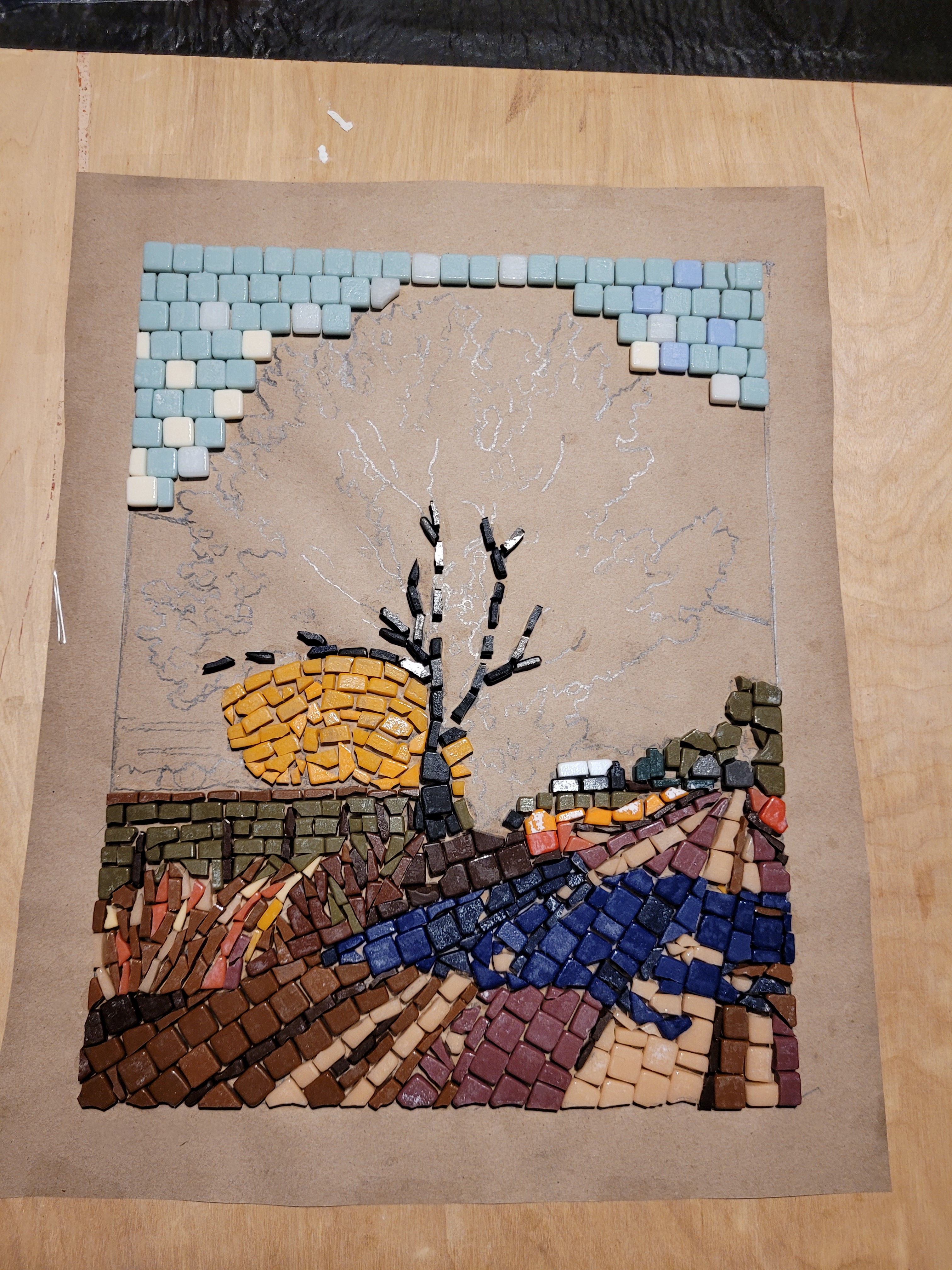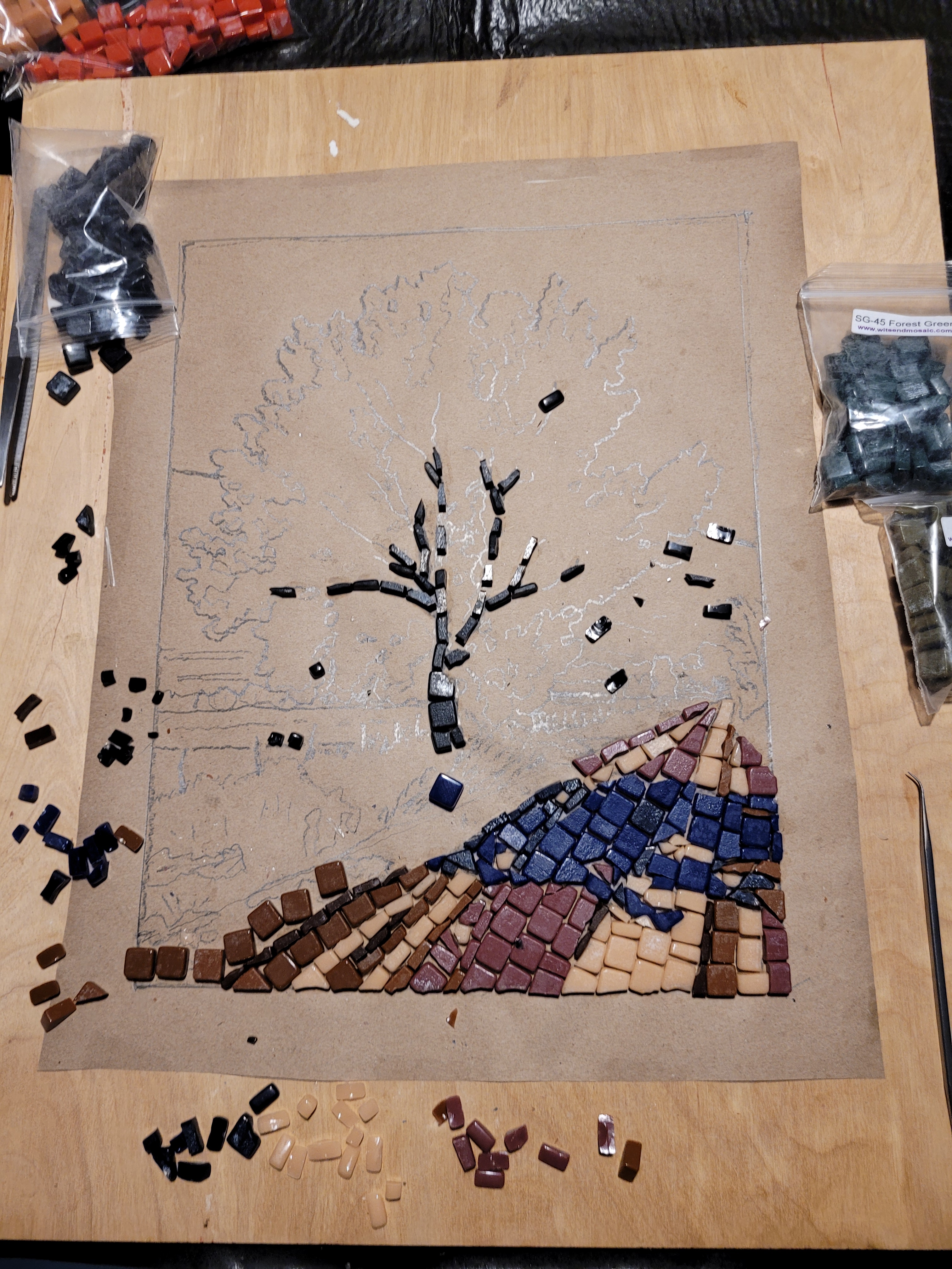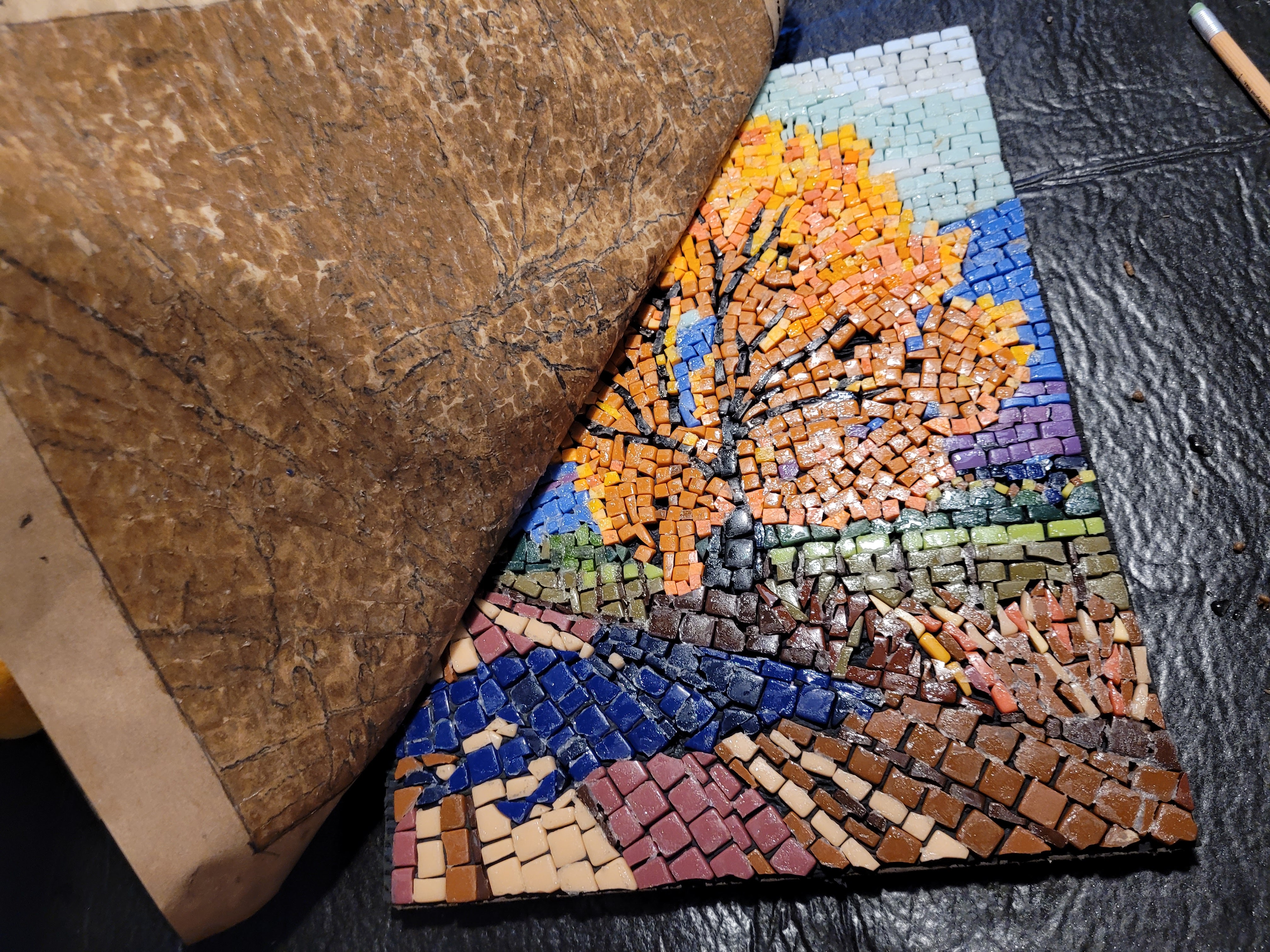 In this second creation I violated many rules of good mosaic making. The spacing between pieces is too close and there is no well-defined pattern in the leaves, but elsewhere. But it is a learning exercize that will make the next one better.