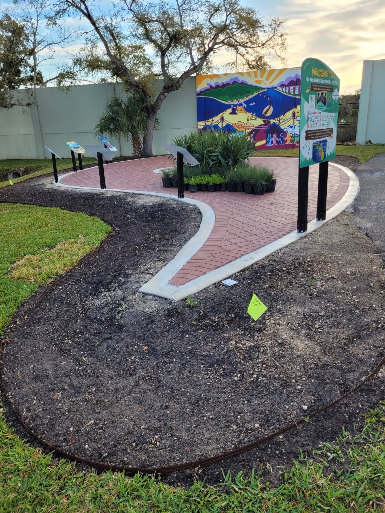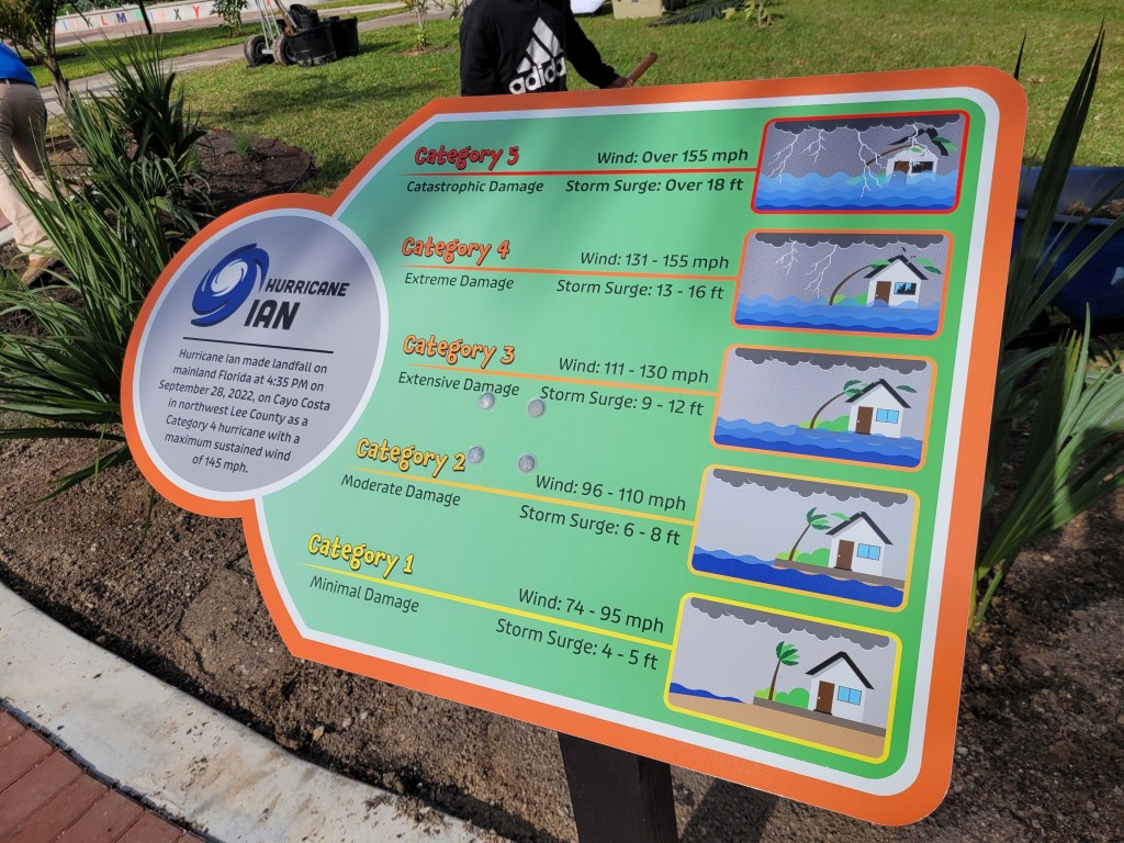 FELI gets credit for the idea of a hurricane Ian remembrance garden; to educate the public about the it-happened-here natural disaster, and how engineering can help minimize the damage. Many donors contributed toward the hardscape. Greater than this environmental beauty and education, the facts presented in their 5 signs might save a life.