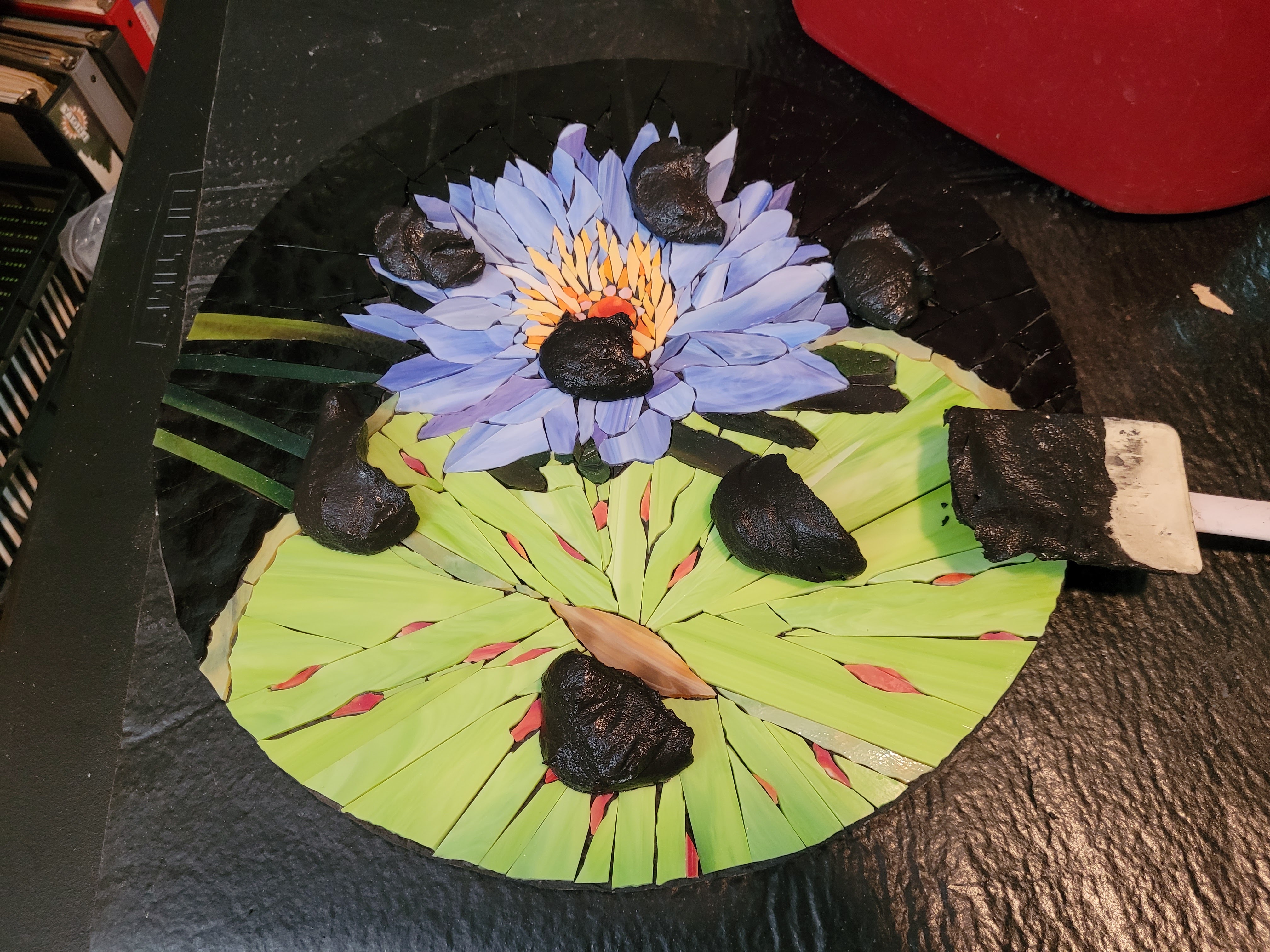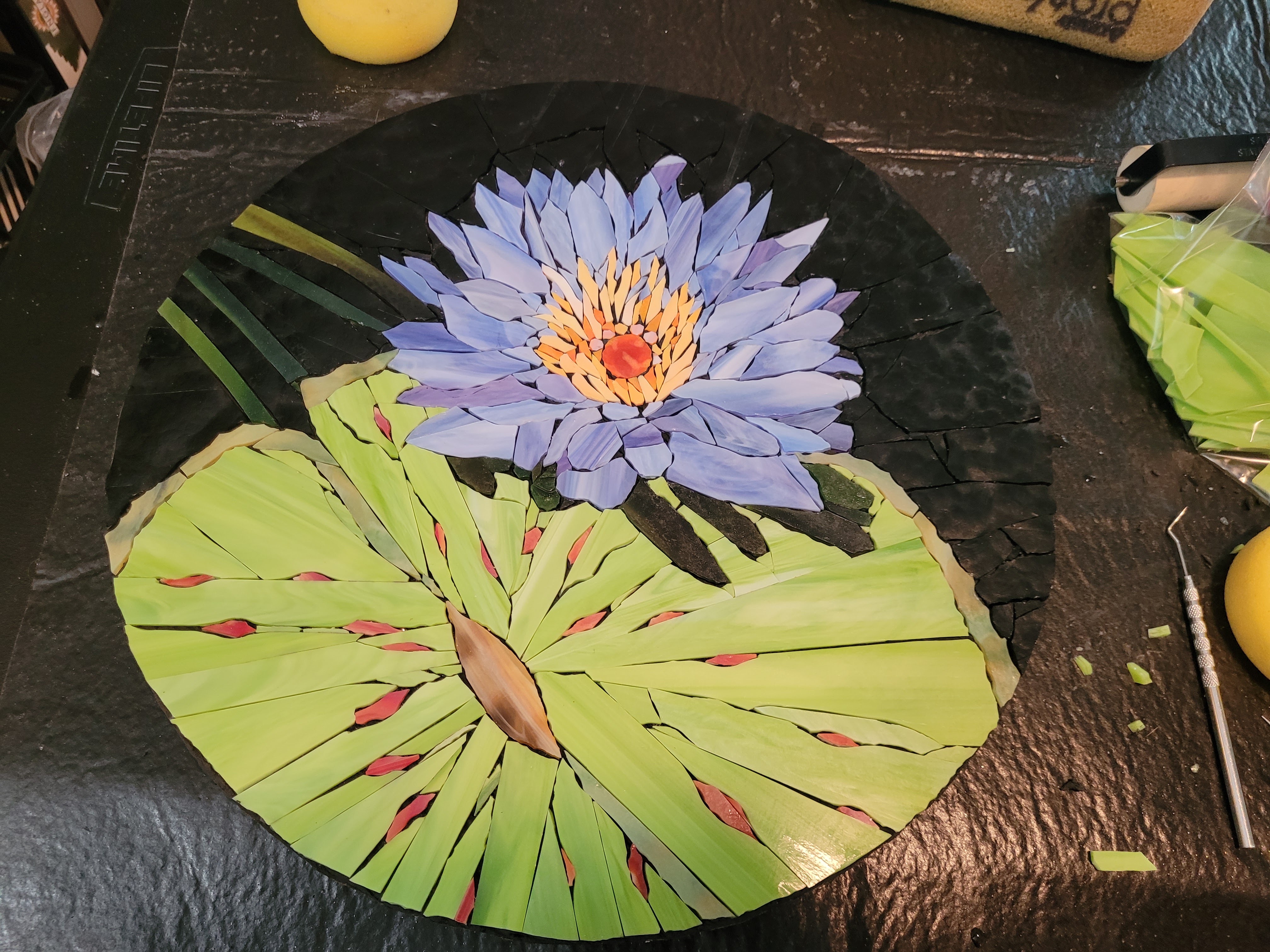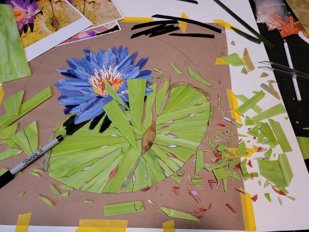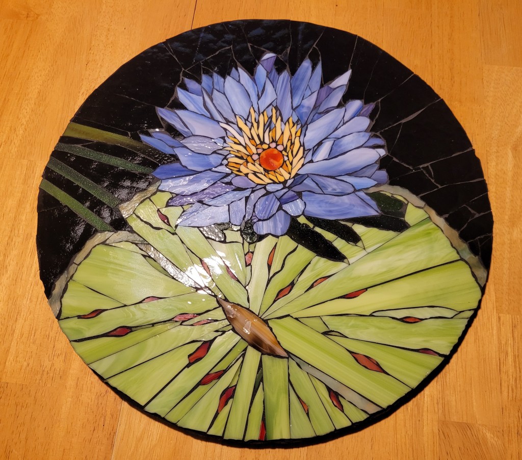 Here is my model. I included the leaf that landed on the leaf.Pencil drawing on craft paper. Cut individual pieces of glass, then glue them face down.This reverse method is a challenge, finding the right color and shade, then gluing it face down.These deep green shadows add depth.This multi-colored sheet of glass resembles the leaf color. The blue pot contains the homemade flour/water glue.Including the red splotches.The black was just right but it had ripples on one side and dimples on the other.Some glass cuts clean. This black tended to shatter.Now to cut uneven triangles to fill these spaces.This murky, swampy sheet was exactly what I needed for the four leaf stems.Done cutting and gluing. This adhesive is for glass tiles. I mixed an acrylic additive with it to make it sturdier and weather-resistant.Oh, and I added black powdered mineral pigment, in case it squeezed through the cracks.Then I flipped the work face down in the “mud”. And wet the paper to peel it off.At last, the right side, face up.After curing for a day, it’s time for grout.Work it into every crack and gradually clean off the excess.It cleaned up quite well.Done, ready to drop into the frame.