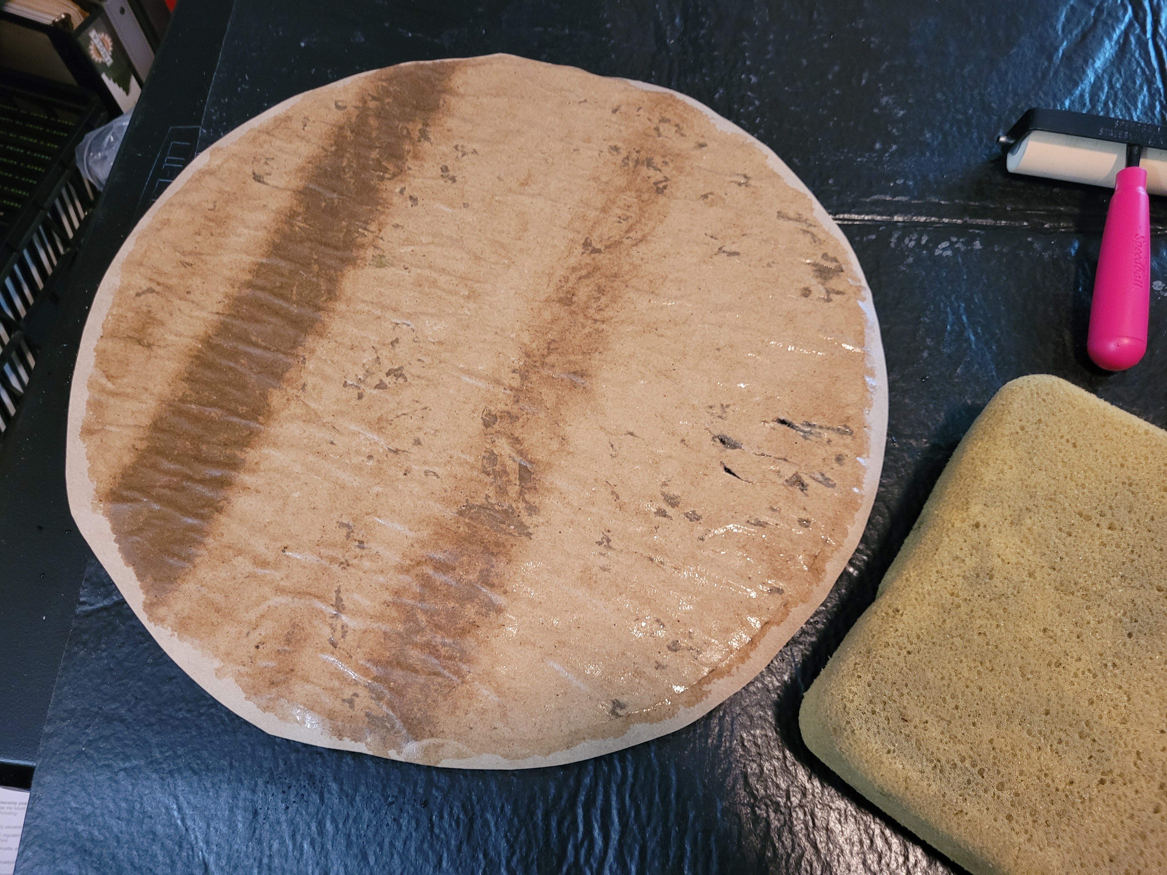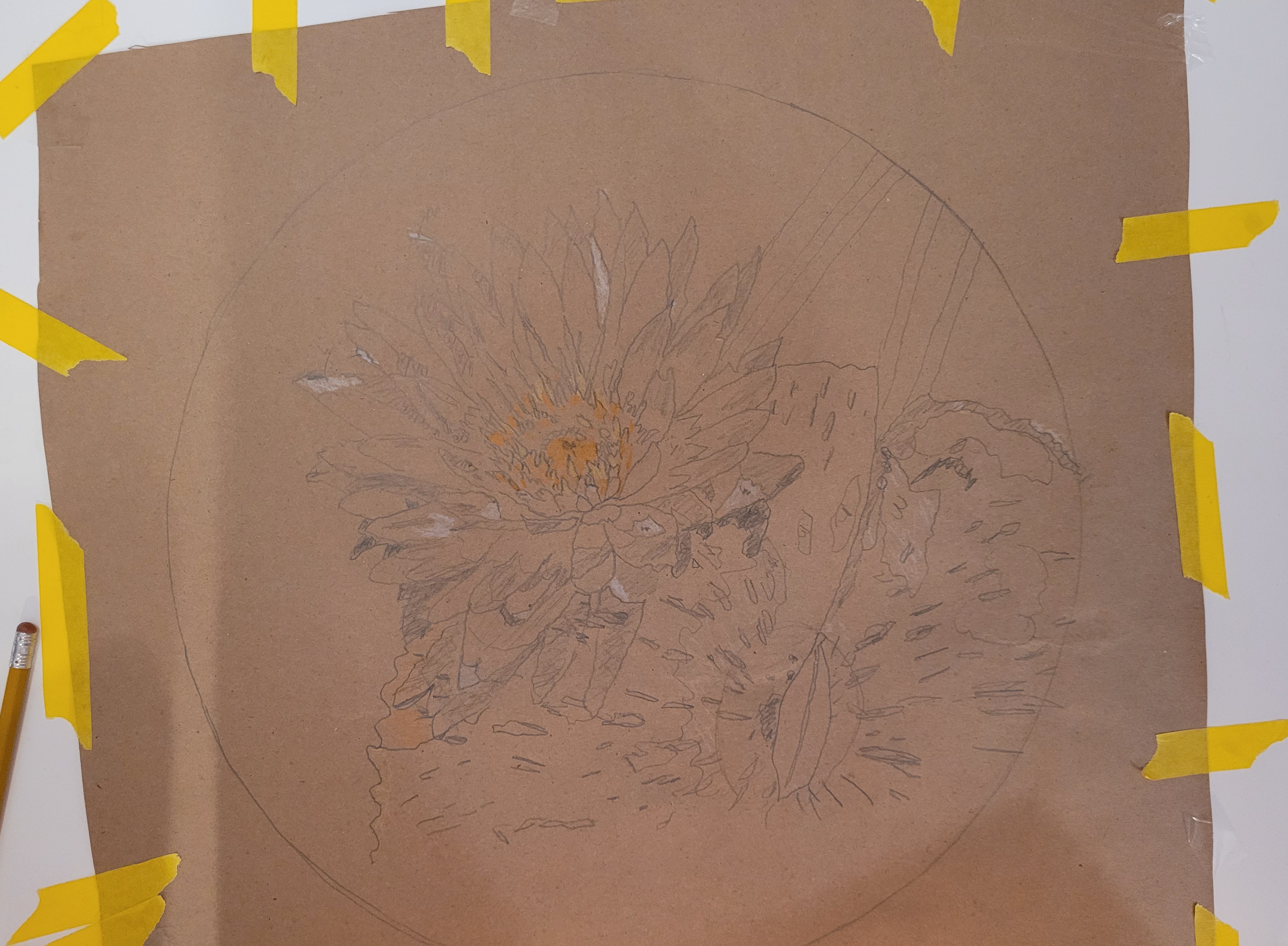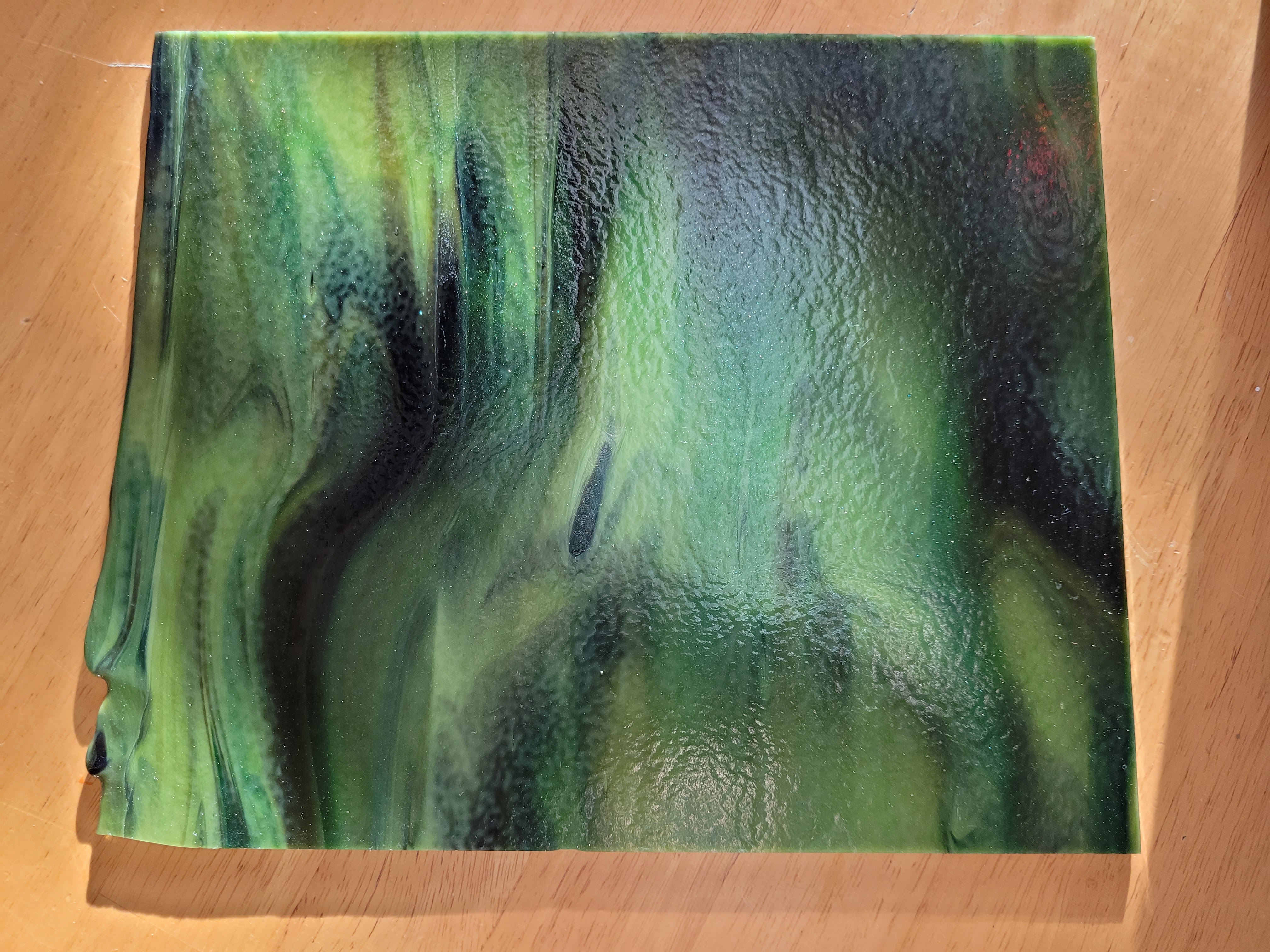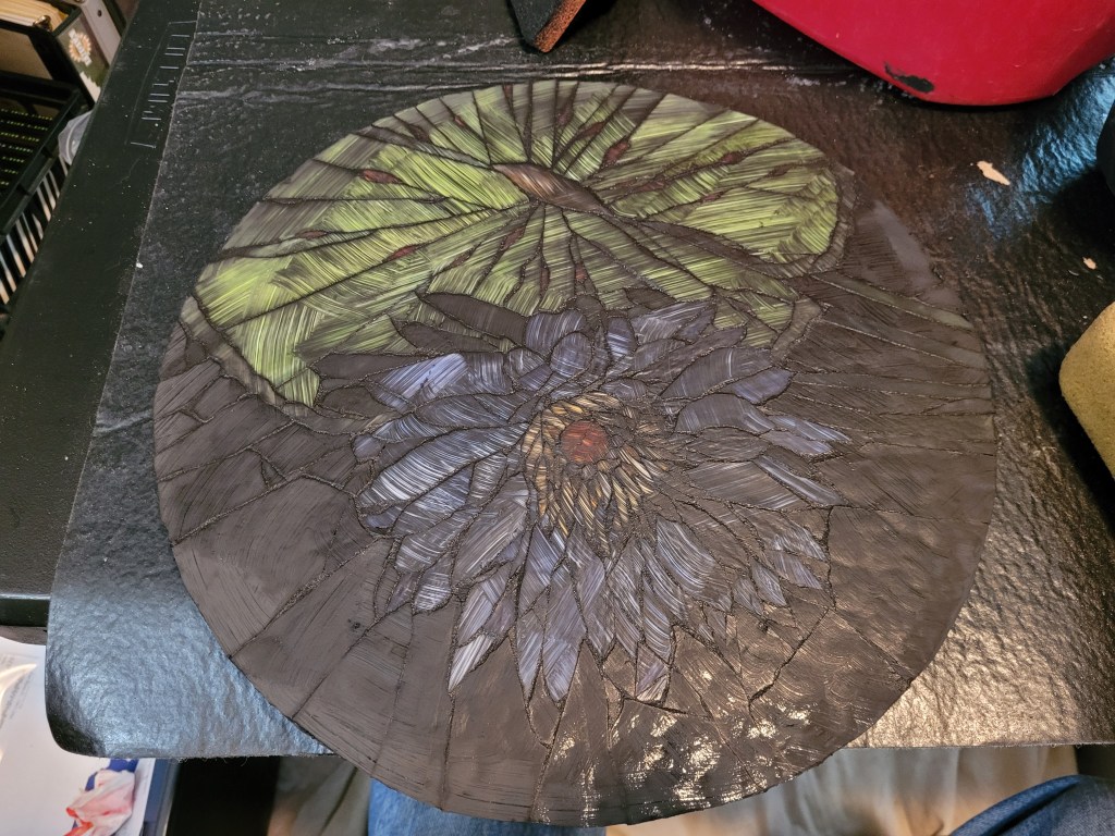 Here is my model. I included the leaf that landed on the leaf.Pencil drawing on craft paper. Cut individual pieces of glass, then glue them face down.This reverse method is a challenge, finding the right color and shade, then gluing it face down.These deep green shadows add depth.This multi-colored sheet of glass resembles the leaf color. The blue pot contains the homemade flour/water glue.Including the red splotches.The black was just right but it had ripples on one side and dimples on the other.Some glass cuts clean. This black tended to shatter.Now to cut uneven triangles to fill these spaces.This murky, swampy sheet was exactly what I needed for the four leaf stems.Done cutting and gluing. This adhesive is for glass tiles. I mixed an acrylic additive with it to make it sturdier and weather-resistant.Oh, and I added black powdered mineral pigment, in case it squeezed through the cracks.Then I flipped the work face down in the “mud”. And wet the paper to peel it off.At last, the right side, face up.After curing for a day, it’s time for grout.Work it into every crack and gradually clean off the excess.It cleaned up quite well.Done, ready to drop into the frame.
