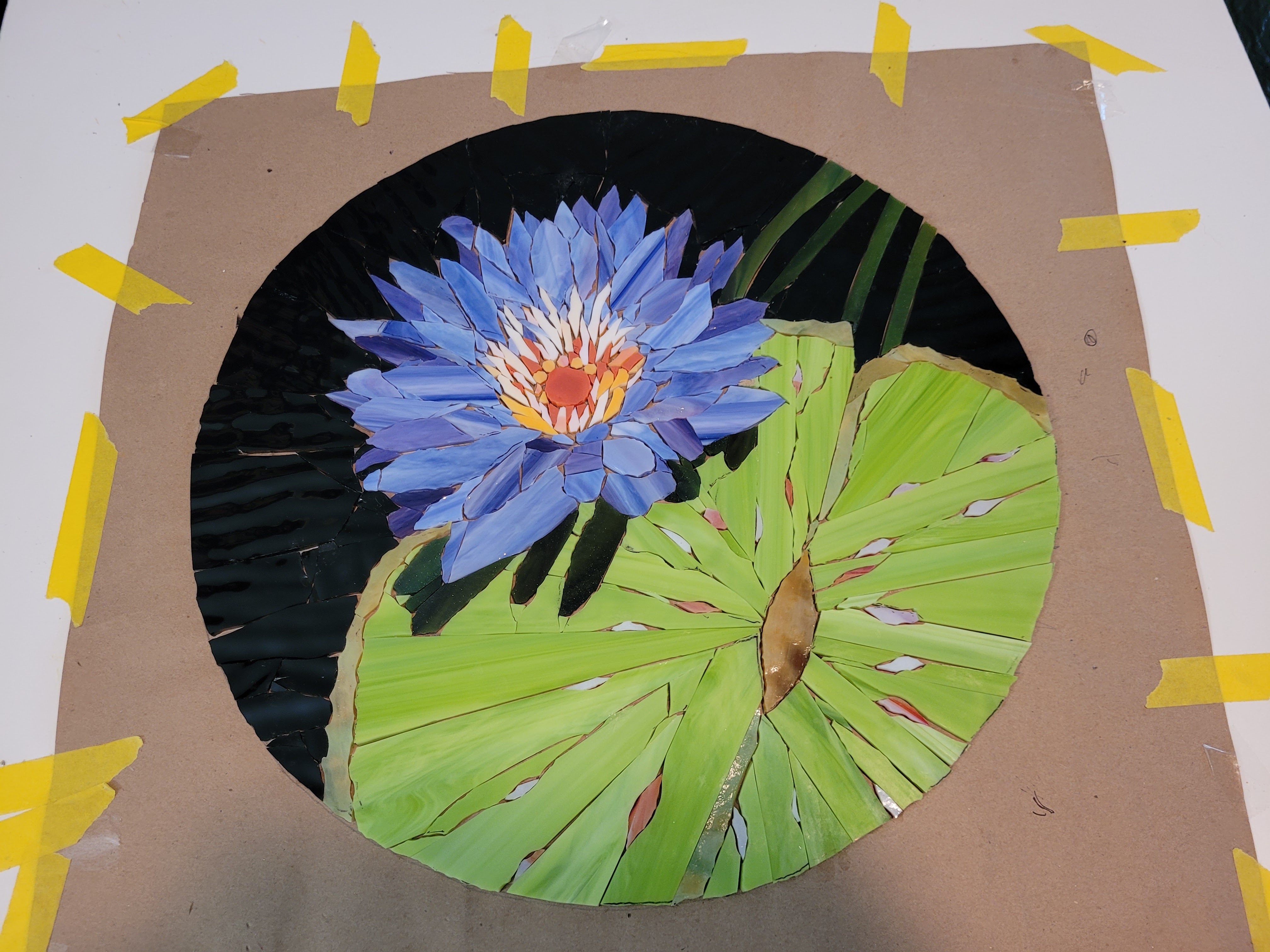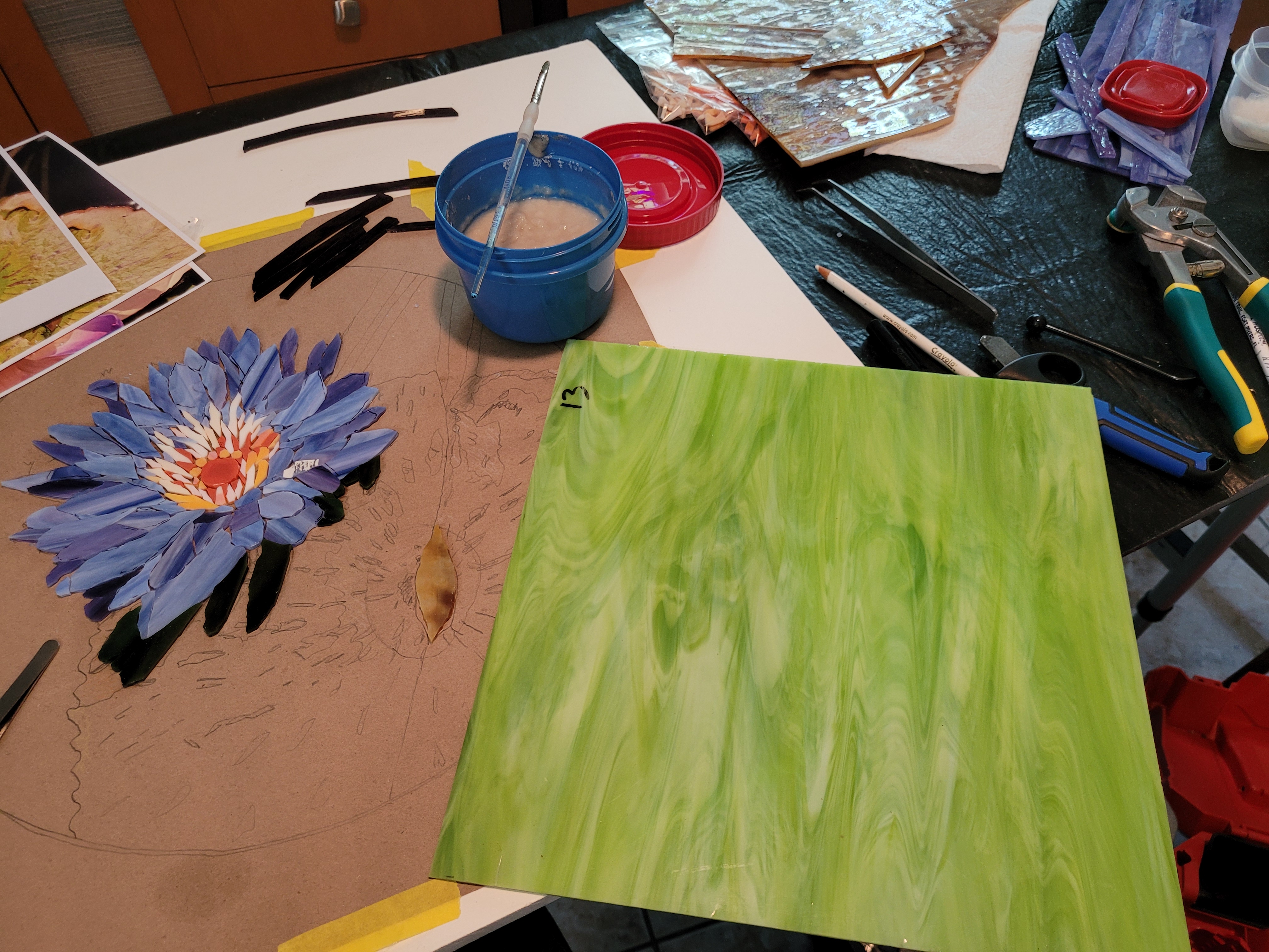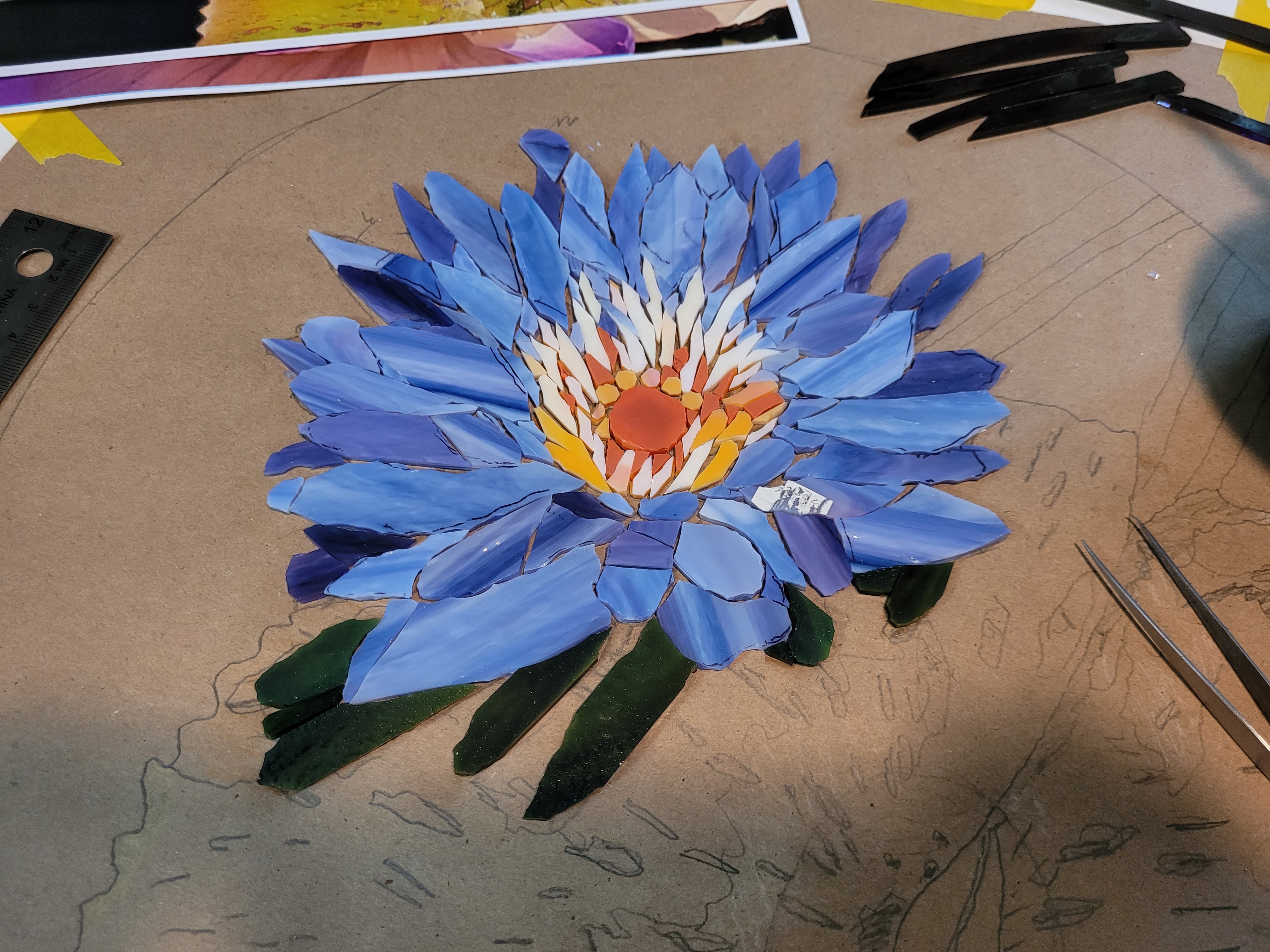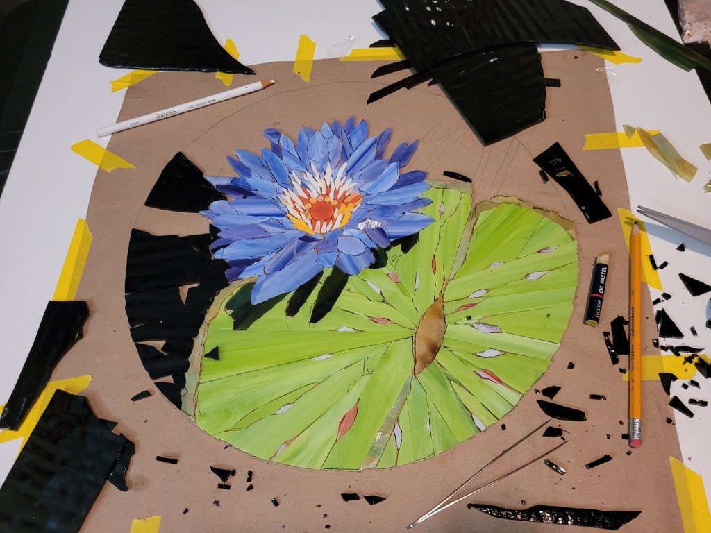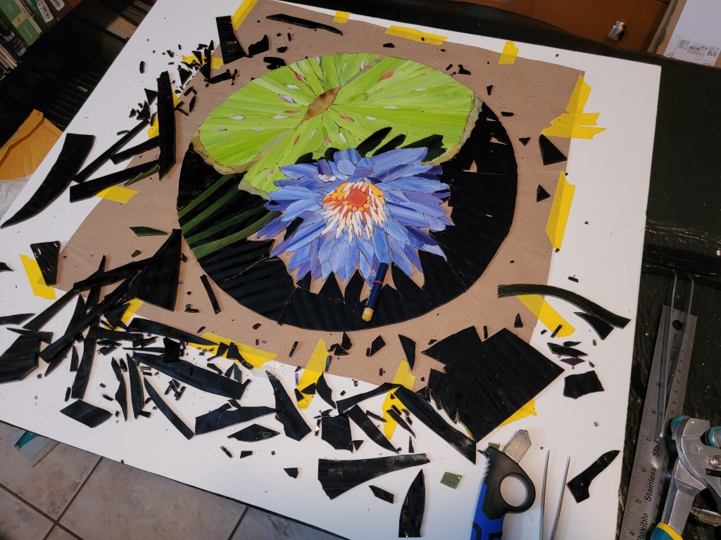 Casola Glass in Fort Myers is an excellent source of art glass for stained glass windows (their specialty) and mosaics. They were short on just-right purples so I converted this flower to blue. It took about three weeks of cutting and gluing and I finished painting the frame today.