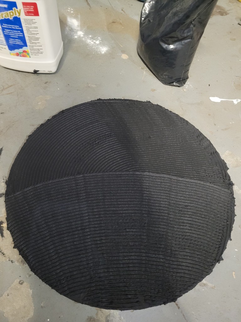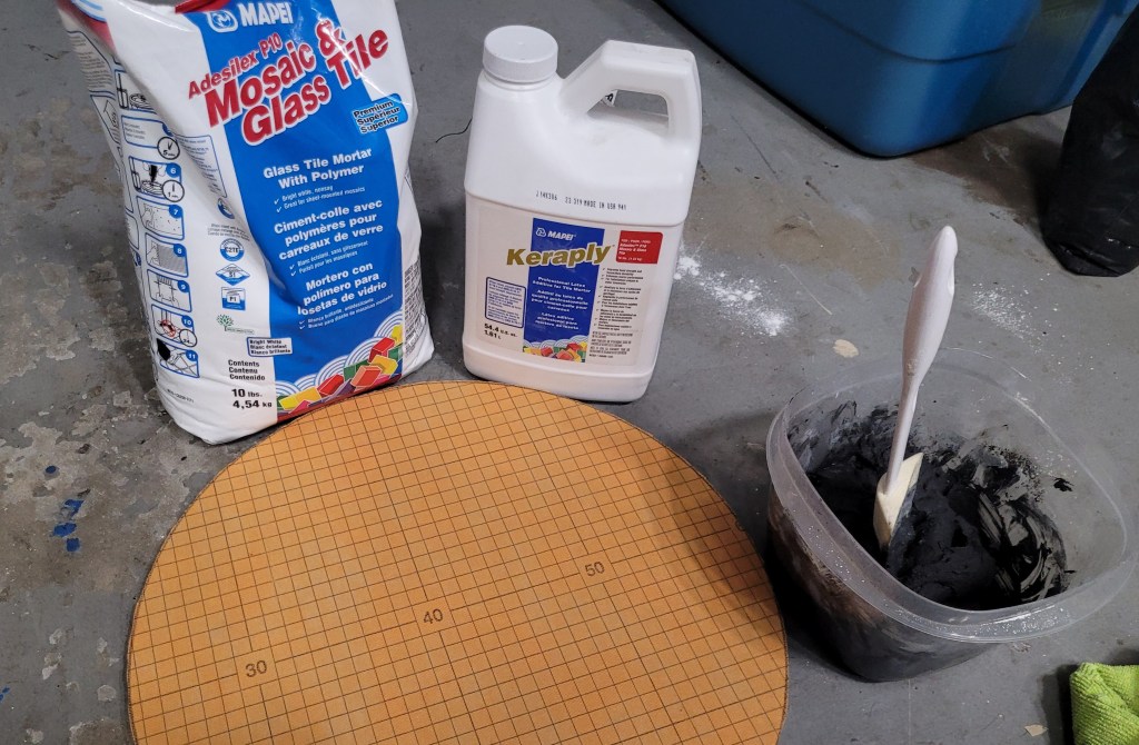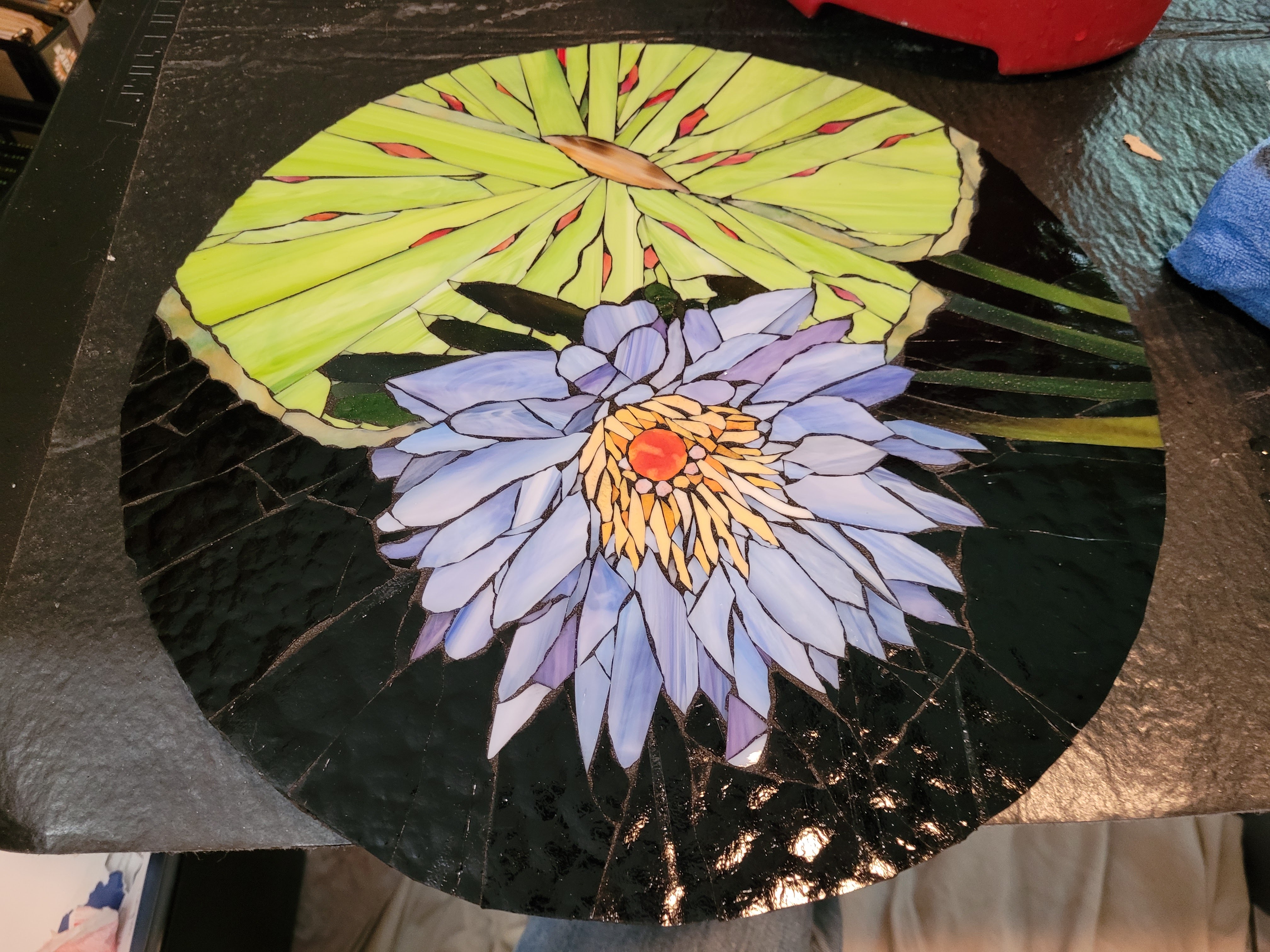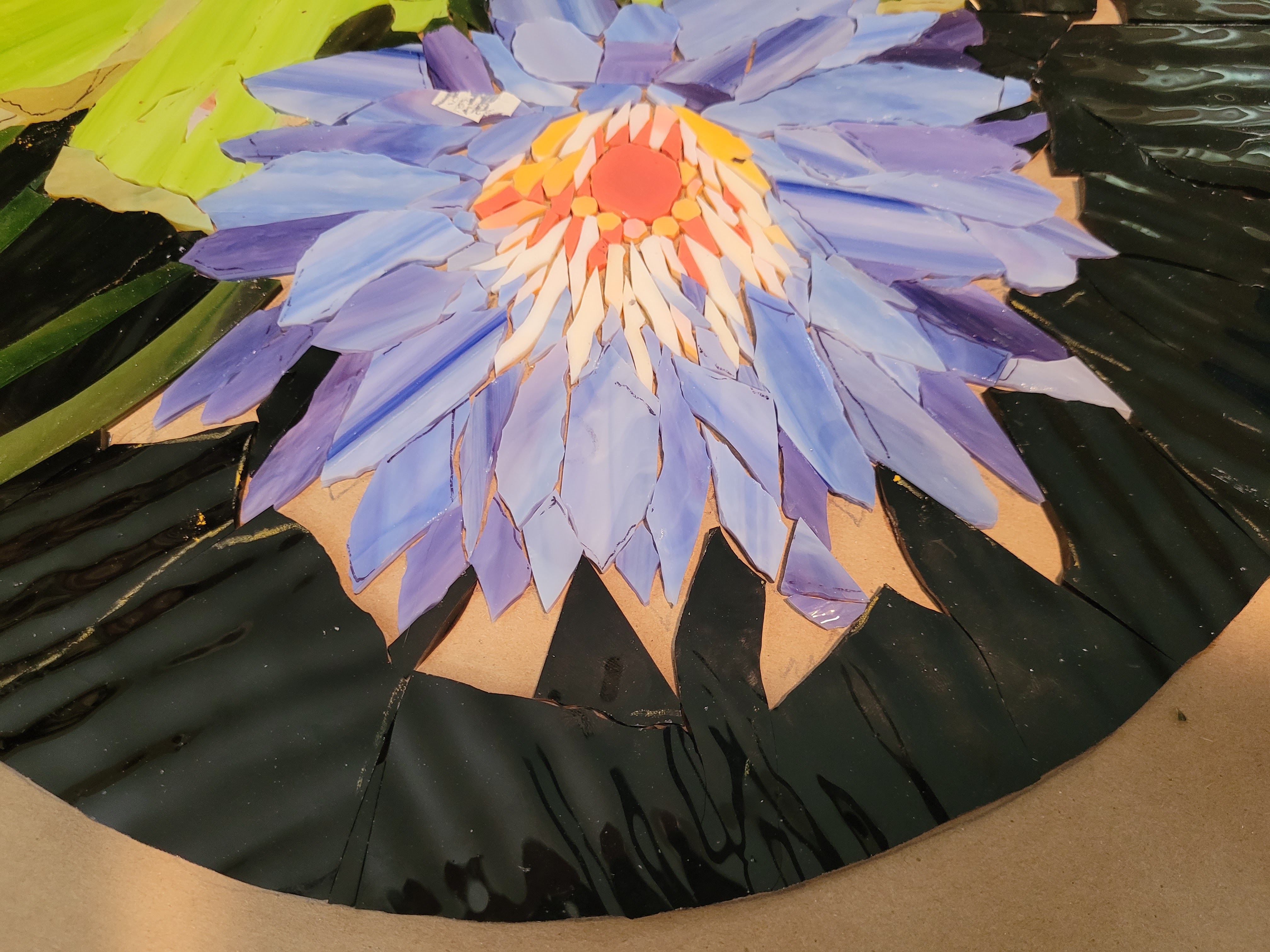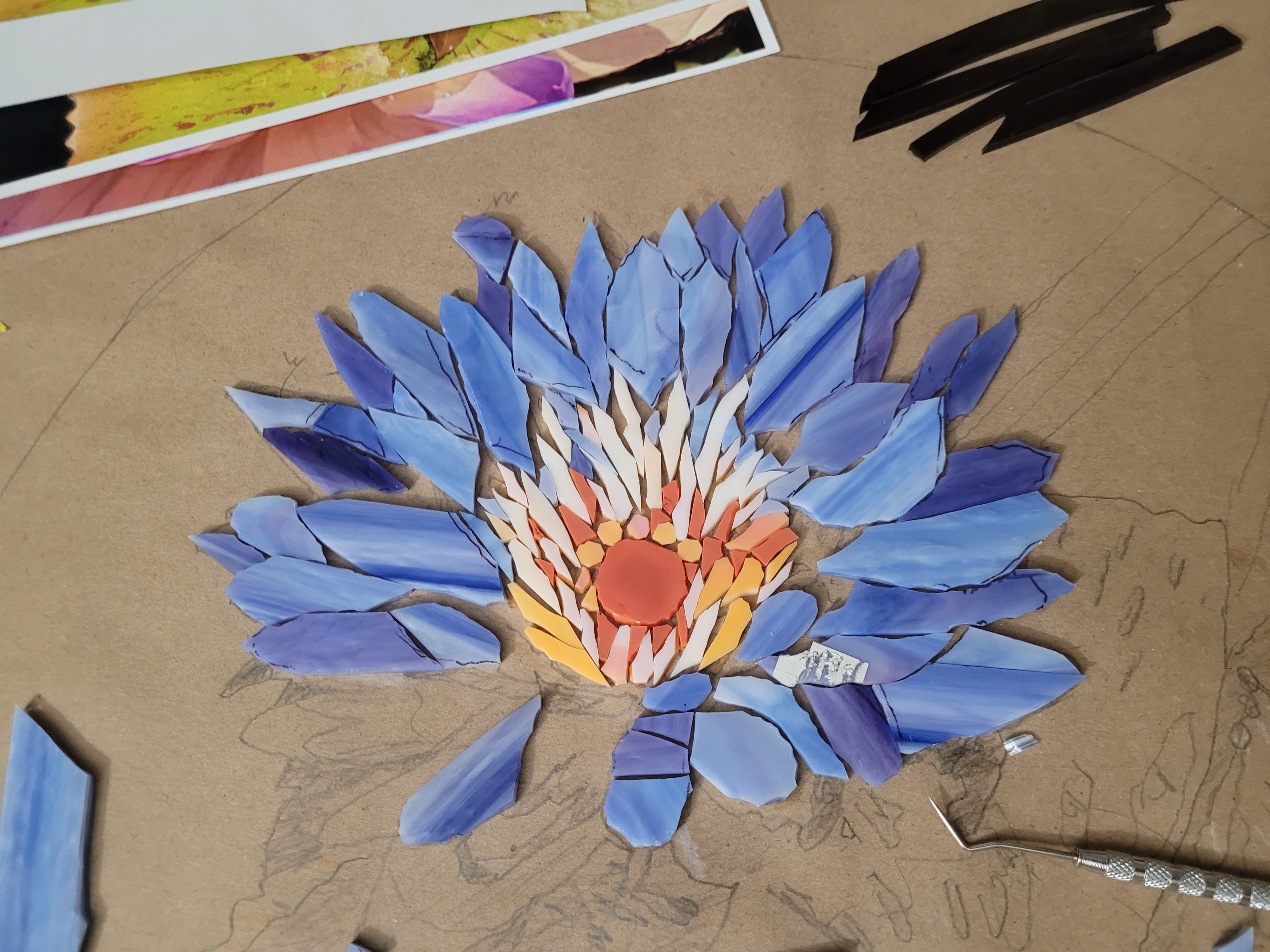 Casola Glass in Fort Myers is an excellent source of art glass for stained glass windows (their specialty) and mosaics. They were short on just-right purples so I converted this flower to blue. It took about three weeks of cutting and gluing and I finished painting the frame today.