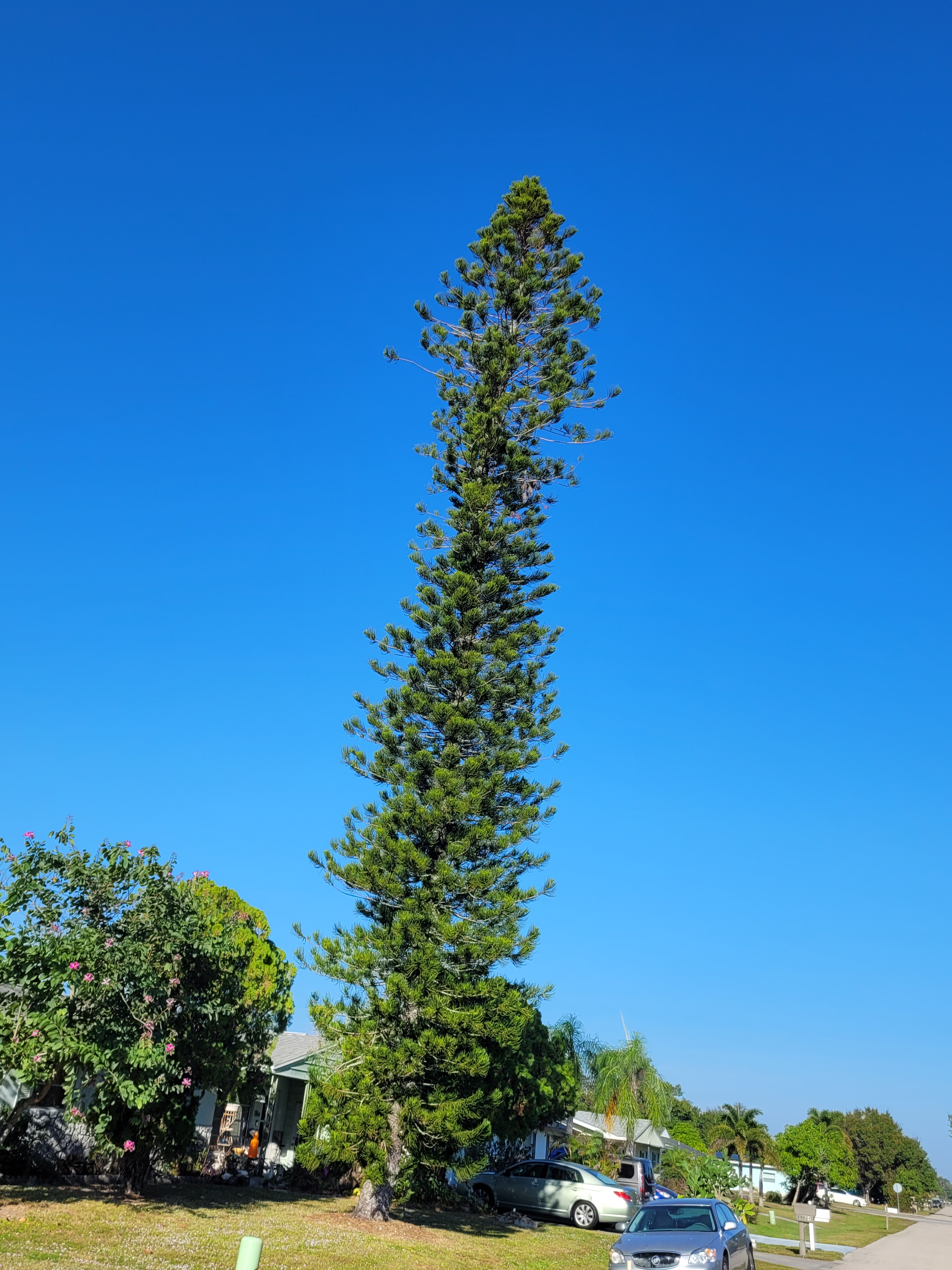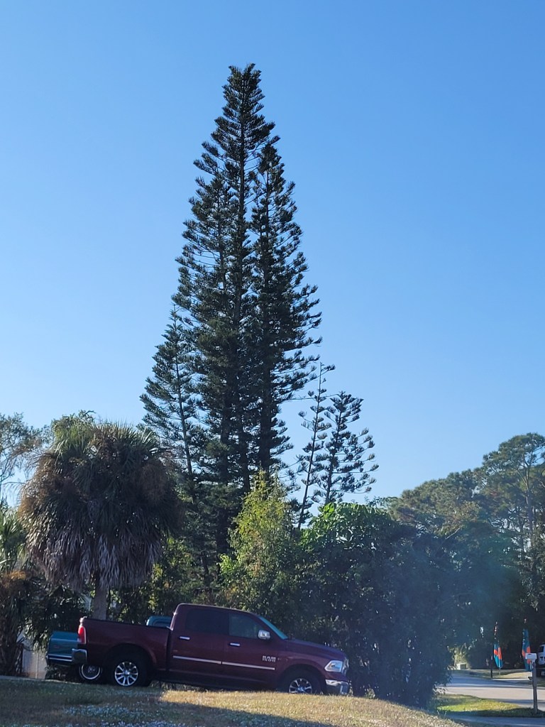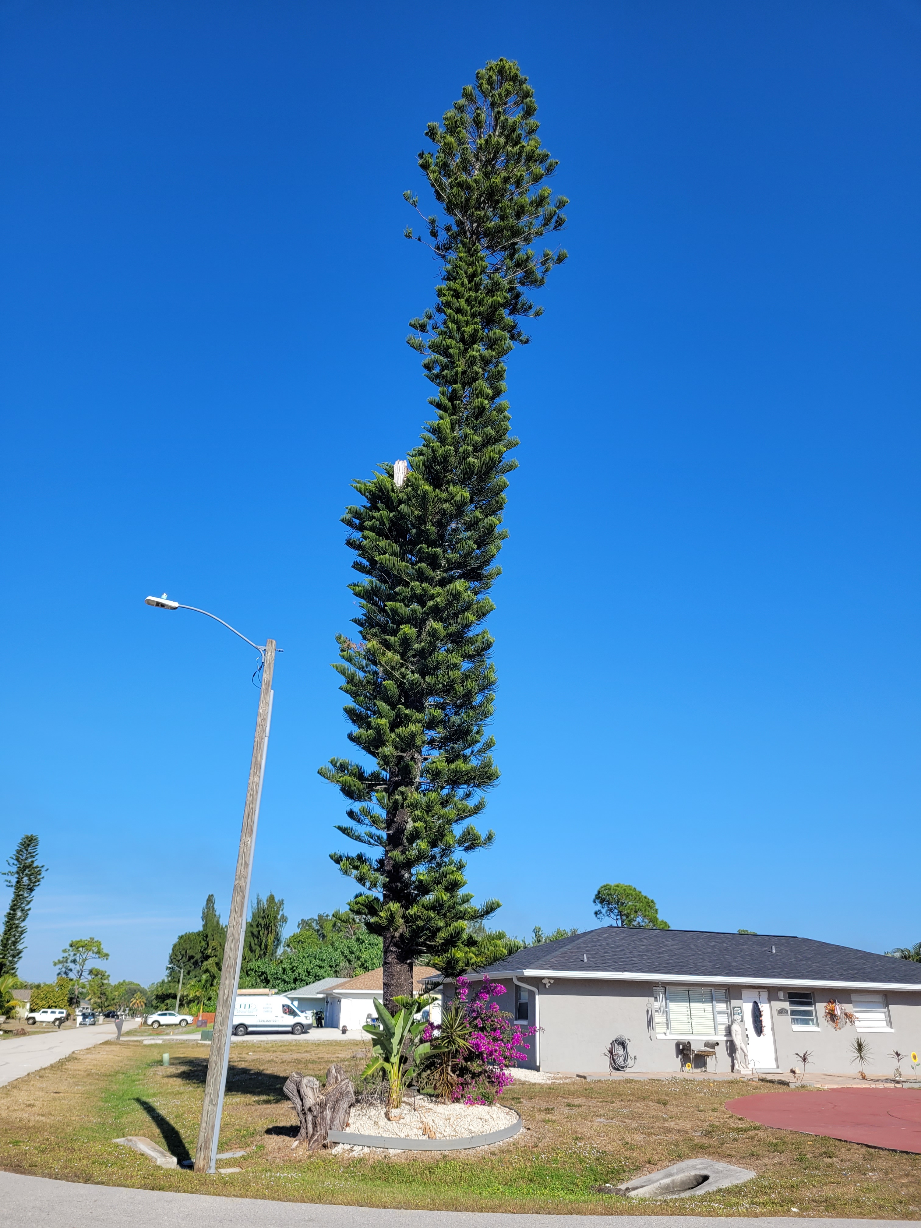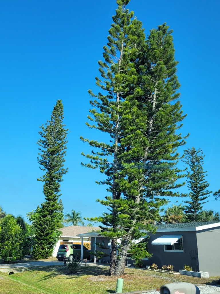 In its native habitat on Norfolk Island/New Caledonia, east of Australia, this needled, non-pine tree can grow up to 200 feet tall! Therein lies the problem. Tall things in Florida break, blow over or get struck by lighting. I did not have to drive far in my neighborhood in S.W. Florida to find numerous, older specimens that show typical hurricane scars. Some are beyond unsightly and are now a serious safety issue. What was once an asset has grown into a liability.