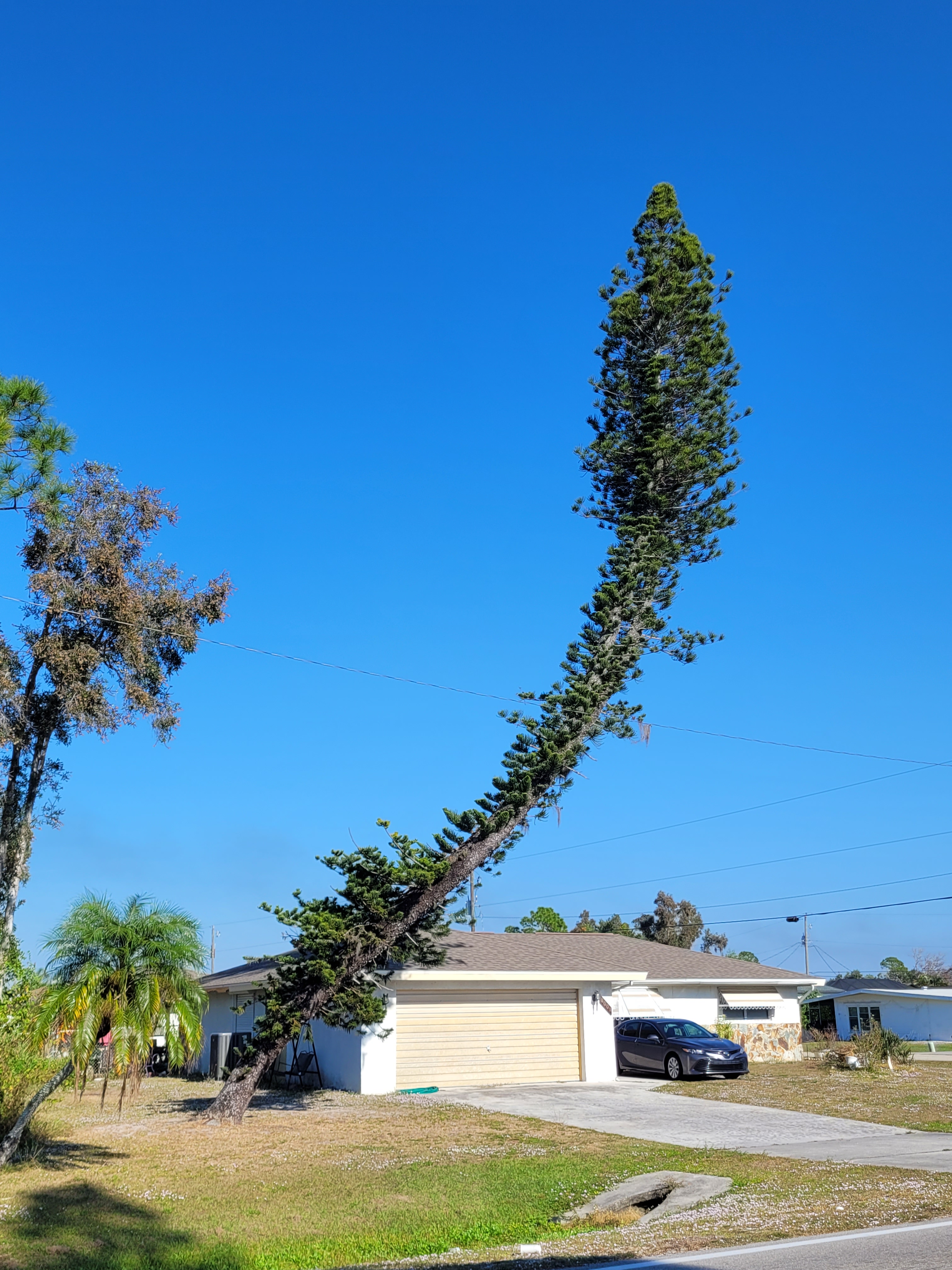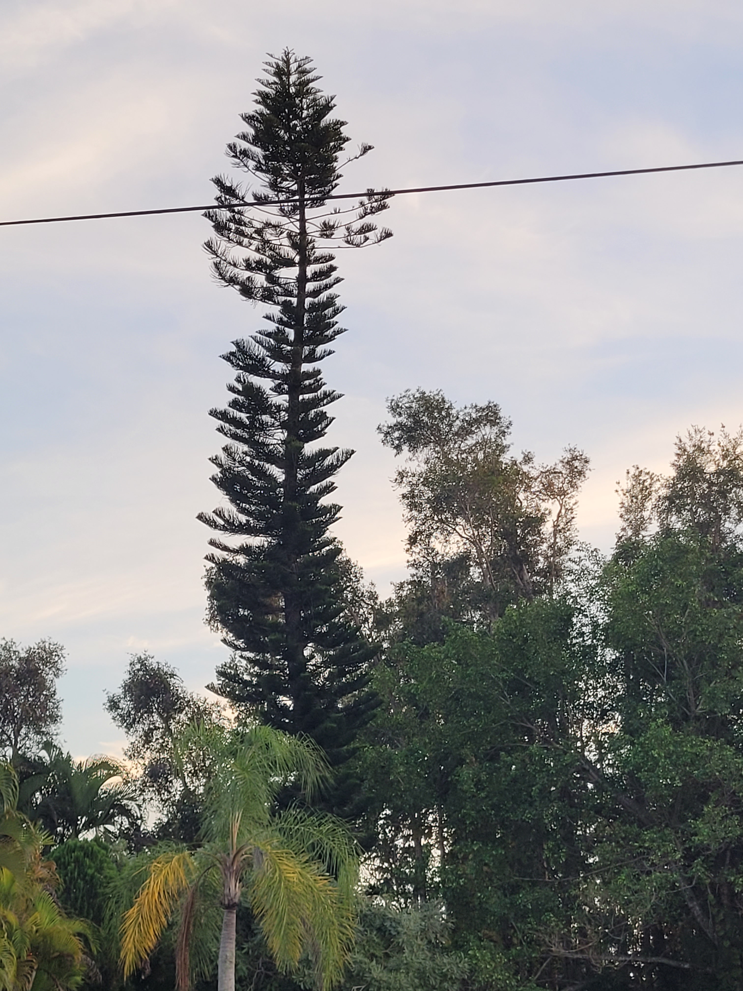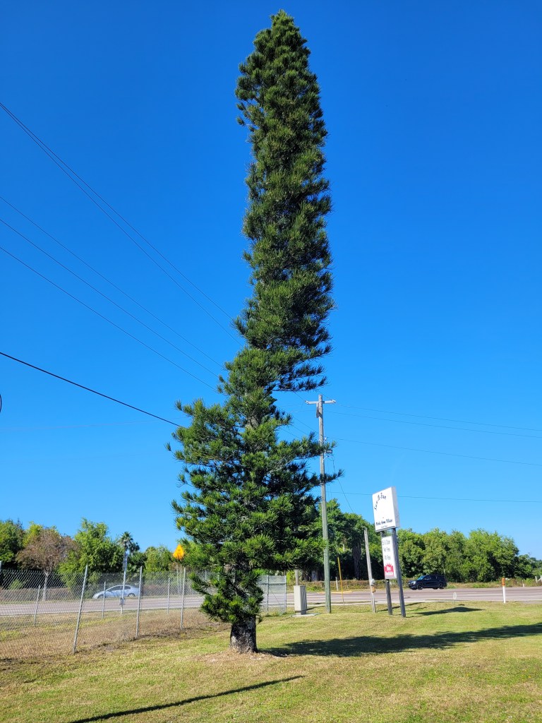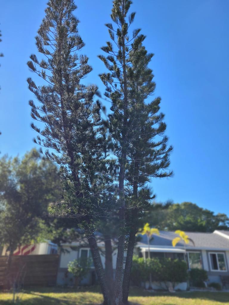 In its native habitat on Norfolk Island/New Caledonia, east of Australia, this needled, non-pine tree can grow up to 200 feet tall! Therein lies the problem. Tall things in Florida break, blow over or get struck by lighting. I did not have to drive far in my neighborhood in S.W. Florida to find numerous, older specimens that show typical hurricane scars. Some are beyond unsightly and are now a serious safety issue. What was once an asset has grown into a liability.