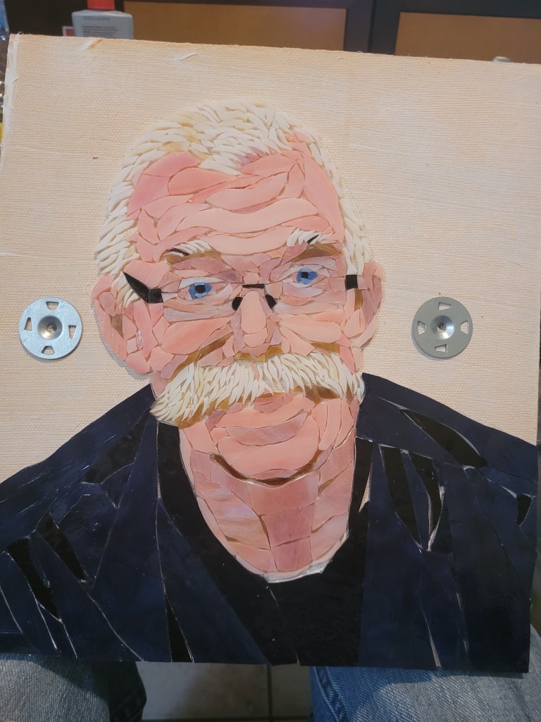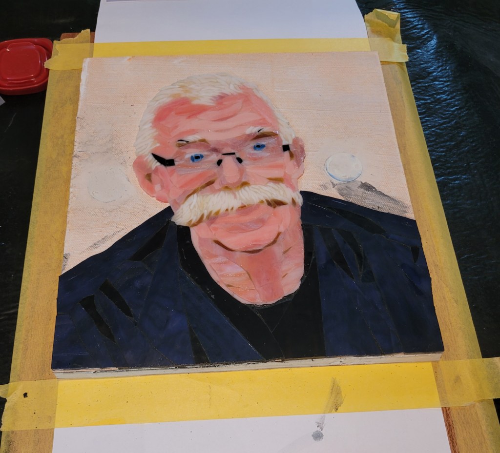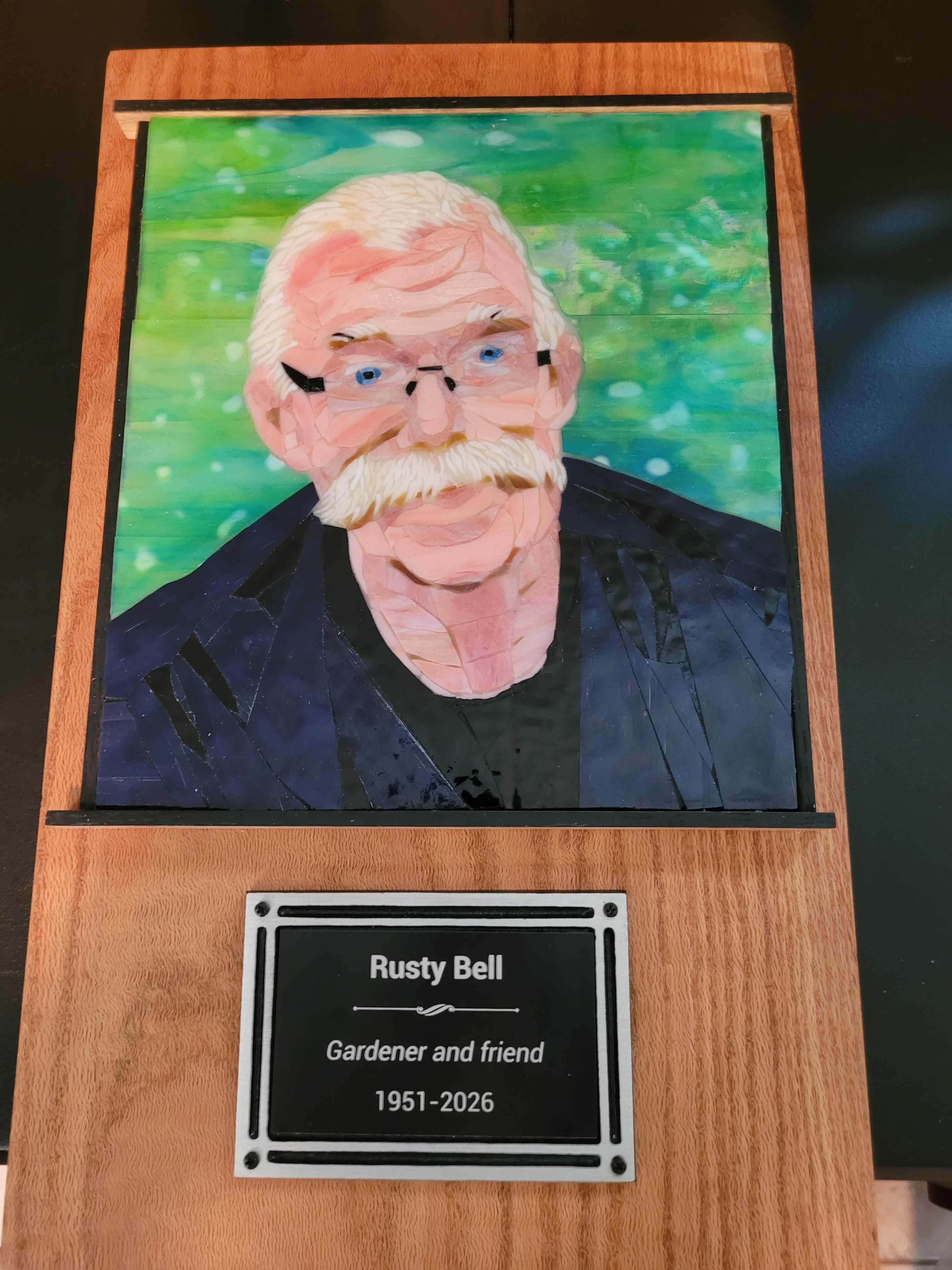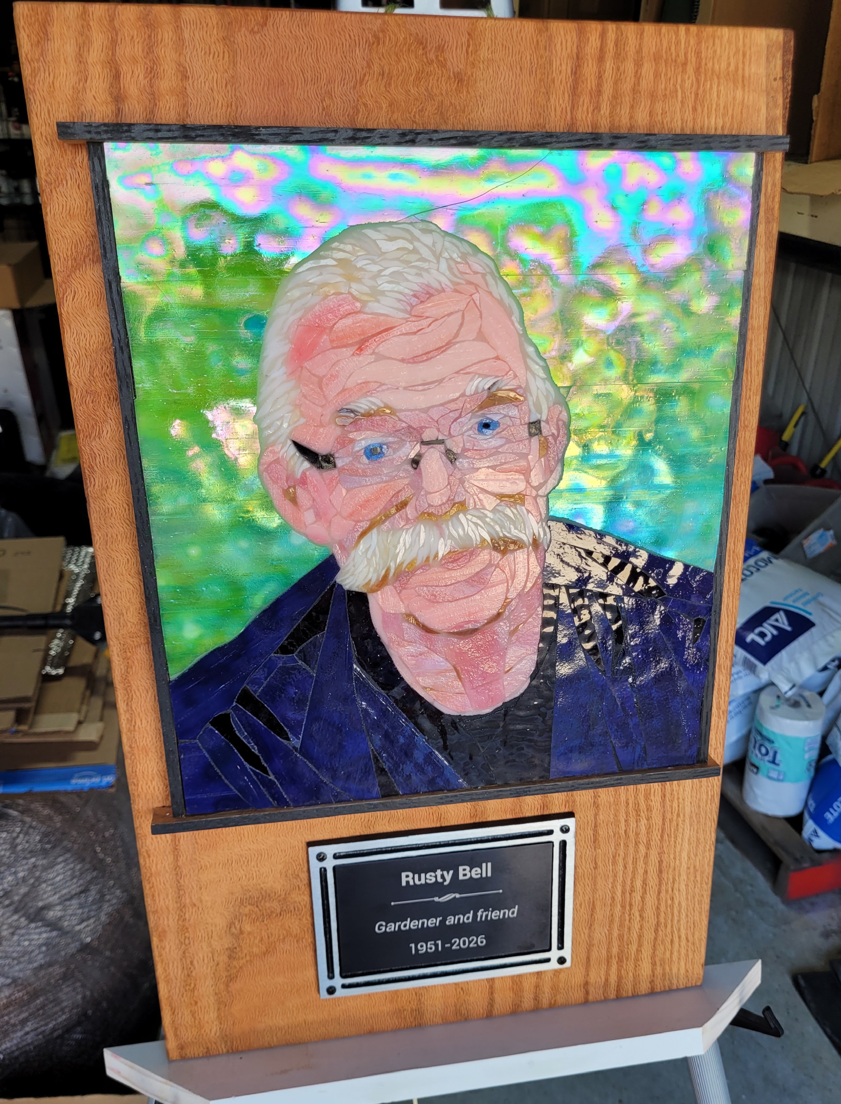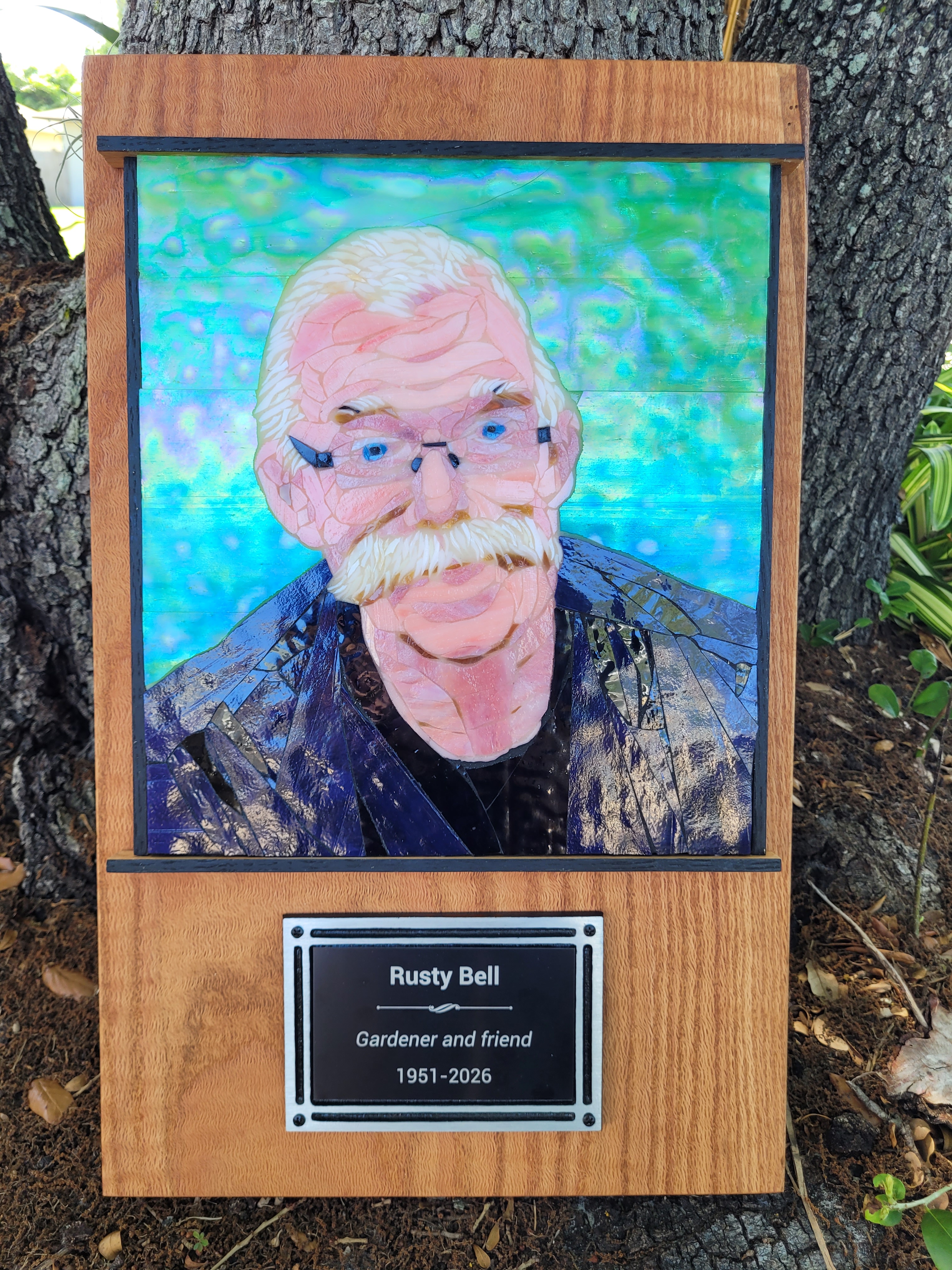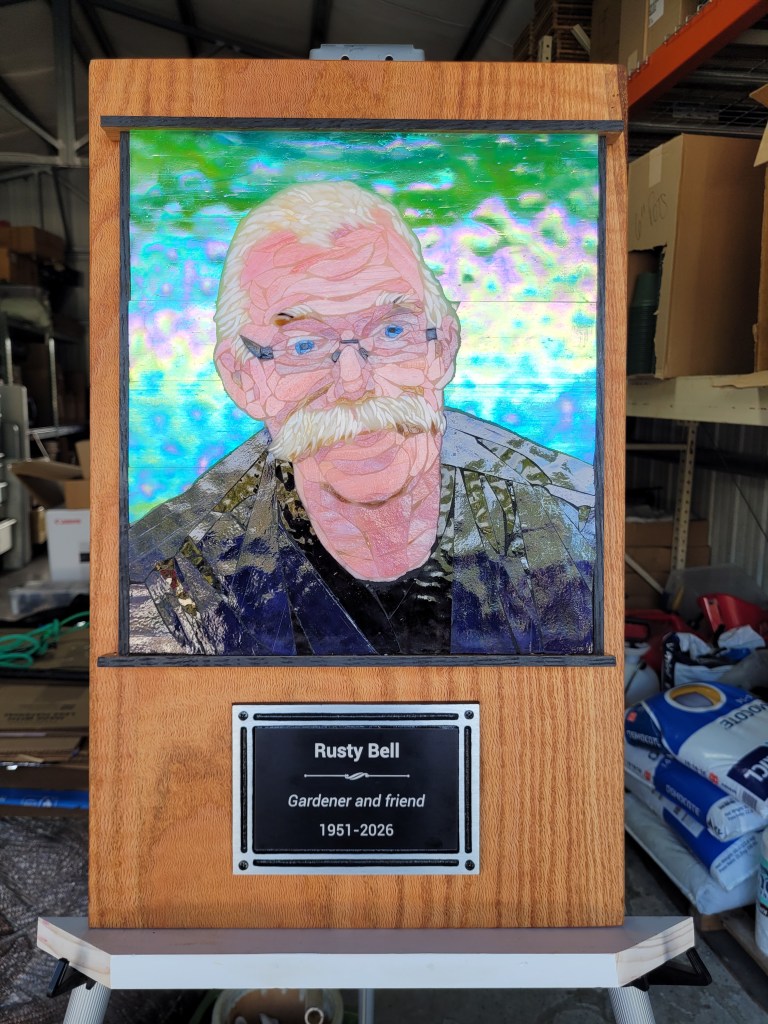 To honor Rusty, I made this mosaic plaque to be displayed at his memorial service at Sundance Orchids. The base is 3/4″ curly red oak, treated with Danish oil to bring out the grain. The mosaic is made from stained glass adhered to Kerdiboard, the stuff they use as tile base in showers and kitchens. Click on each photo for details of its construction.