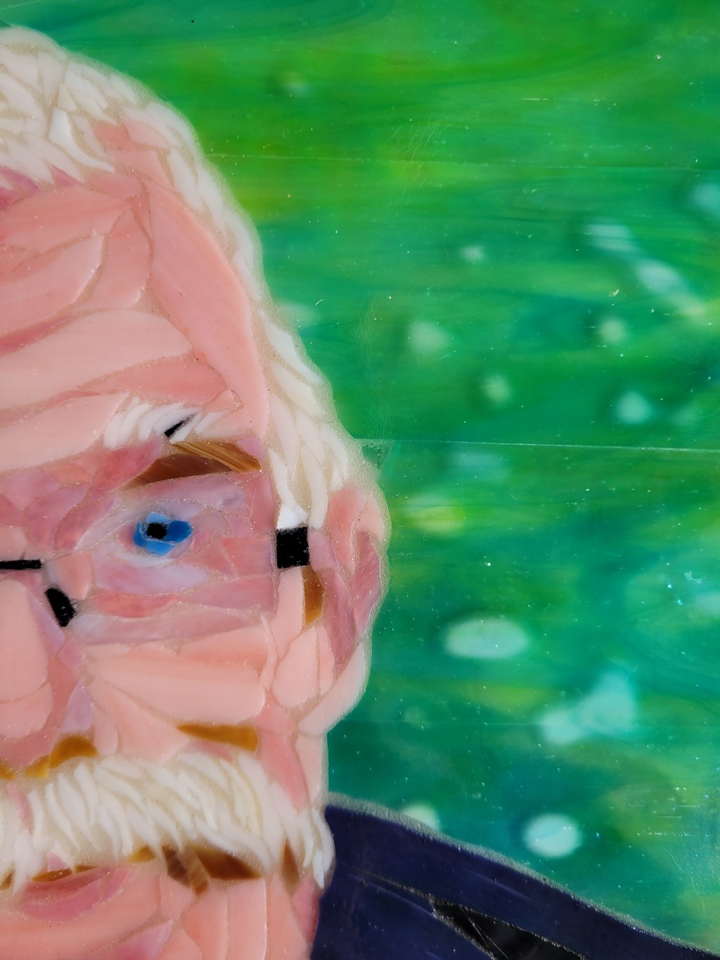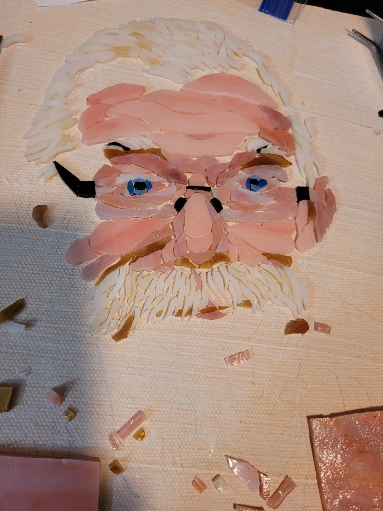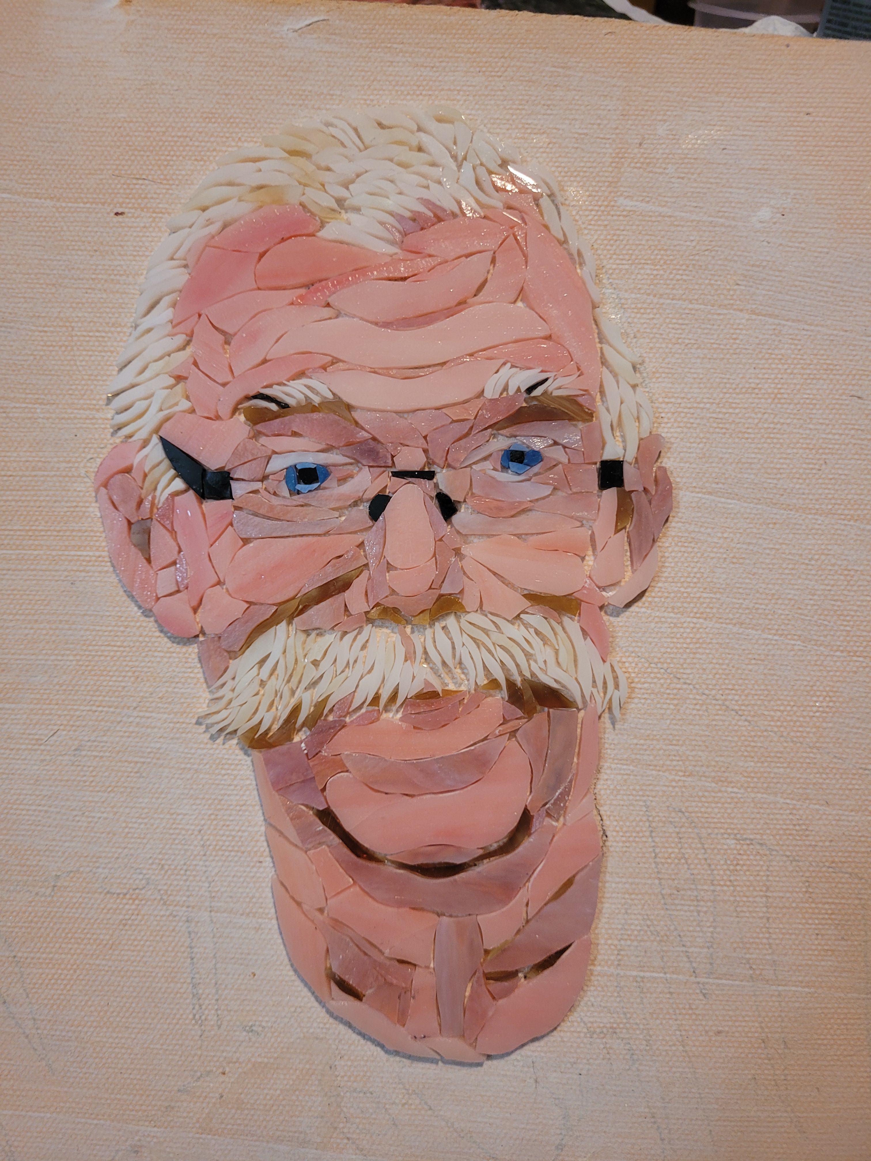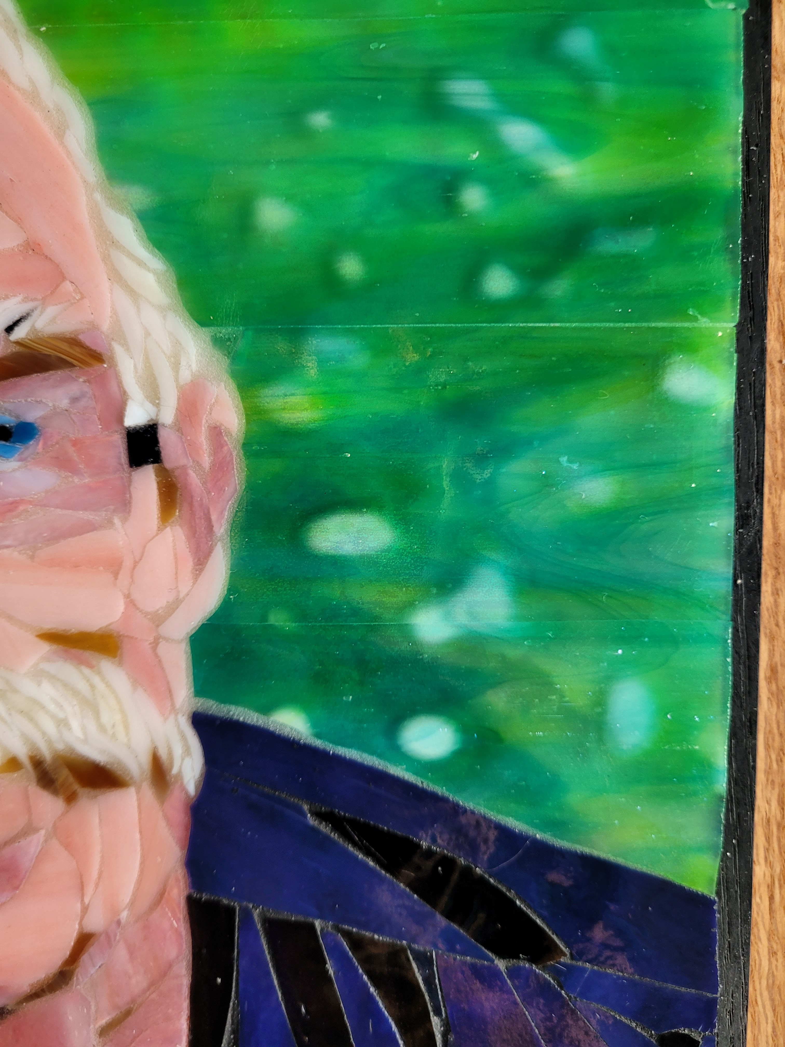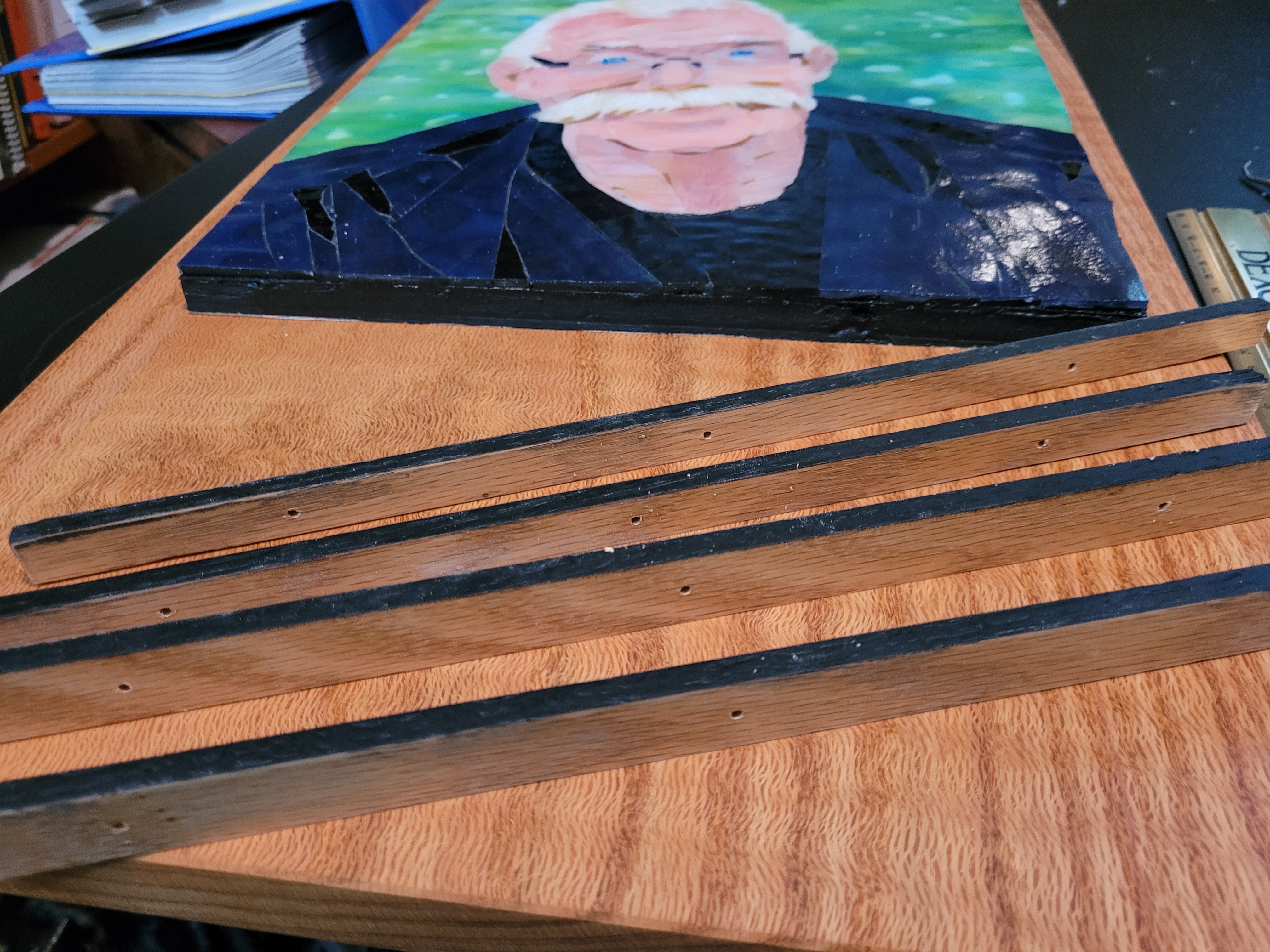 To honor Rusty, I made this mosaic plaque to be displayed at his memorial service at Sundance Orchids. The base is 3/4″ curly red oak, treated with Danish oil to bring out the grain. The mosaic is made from stained glass adhered to Kerdiboard, the stuff they use as tile base in showers and kitchens. Click on each photo for details of its construction.