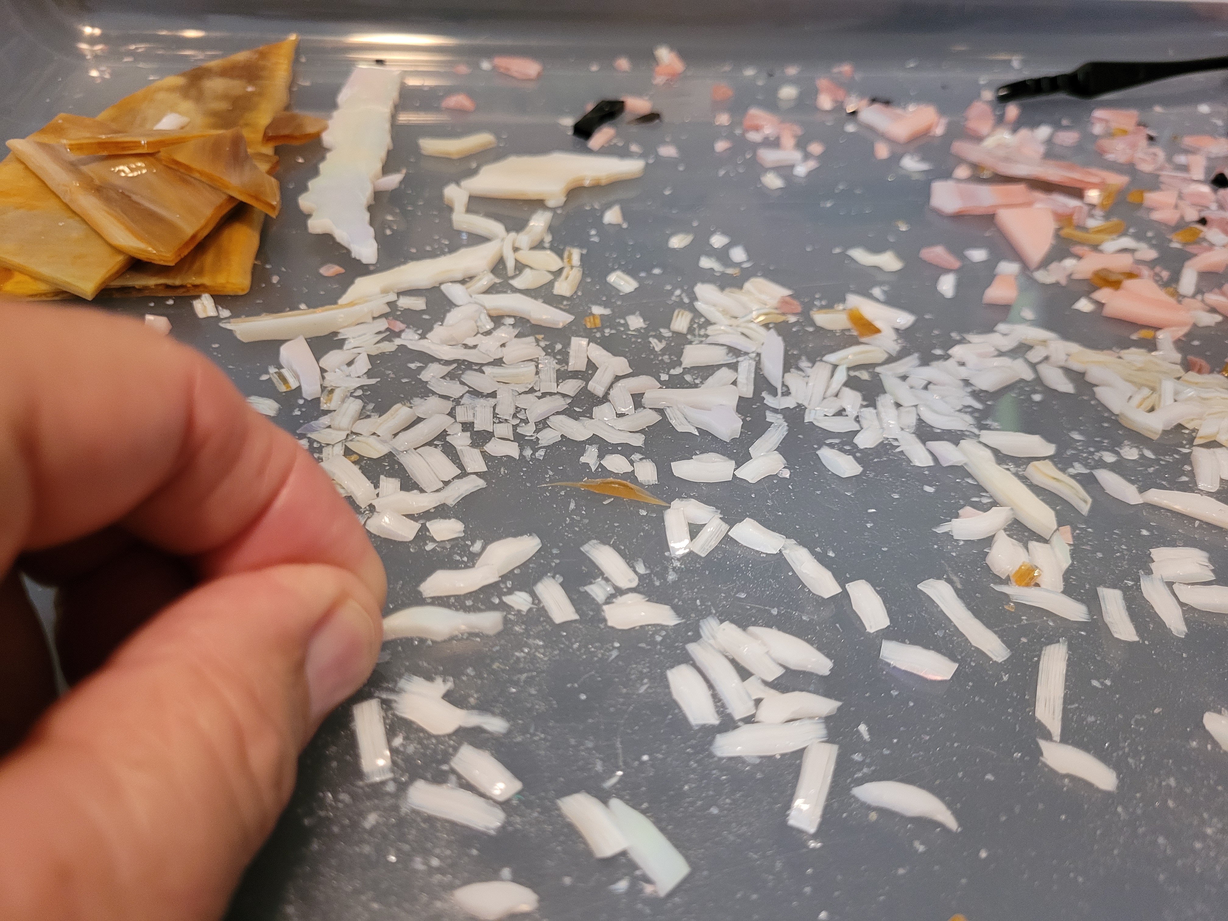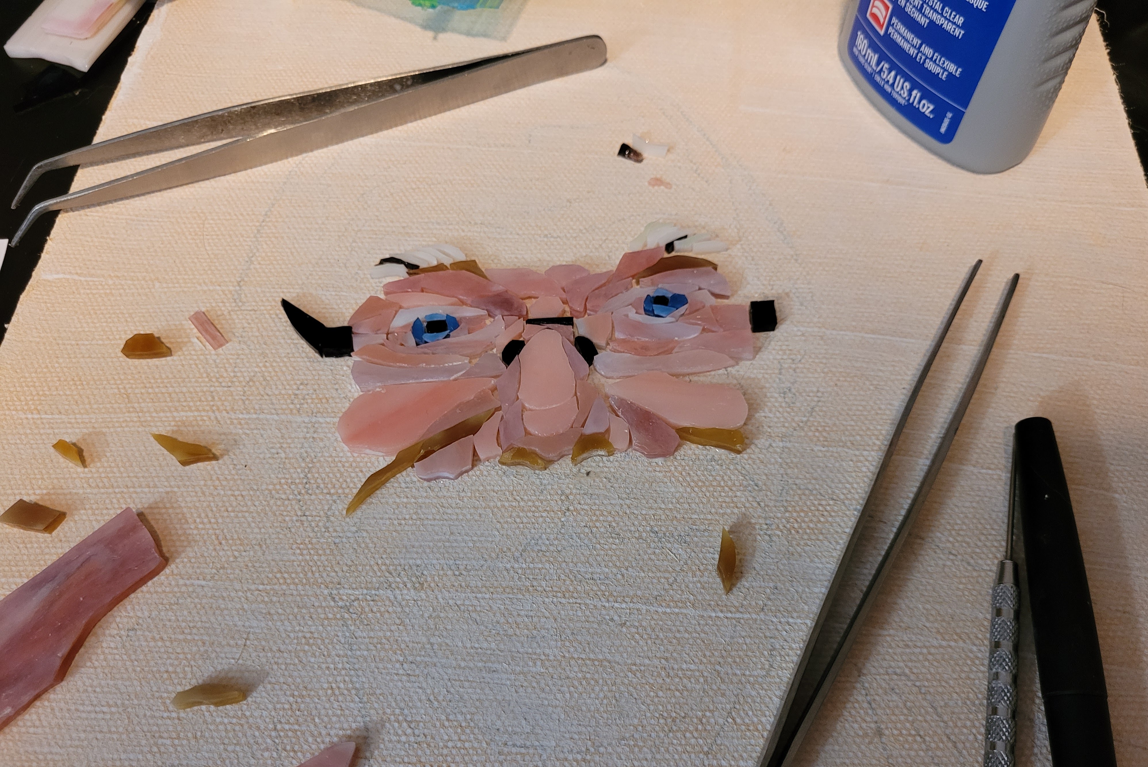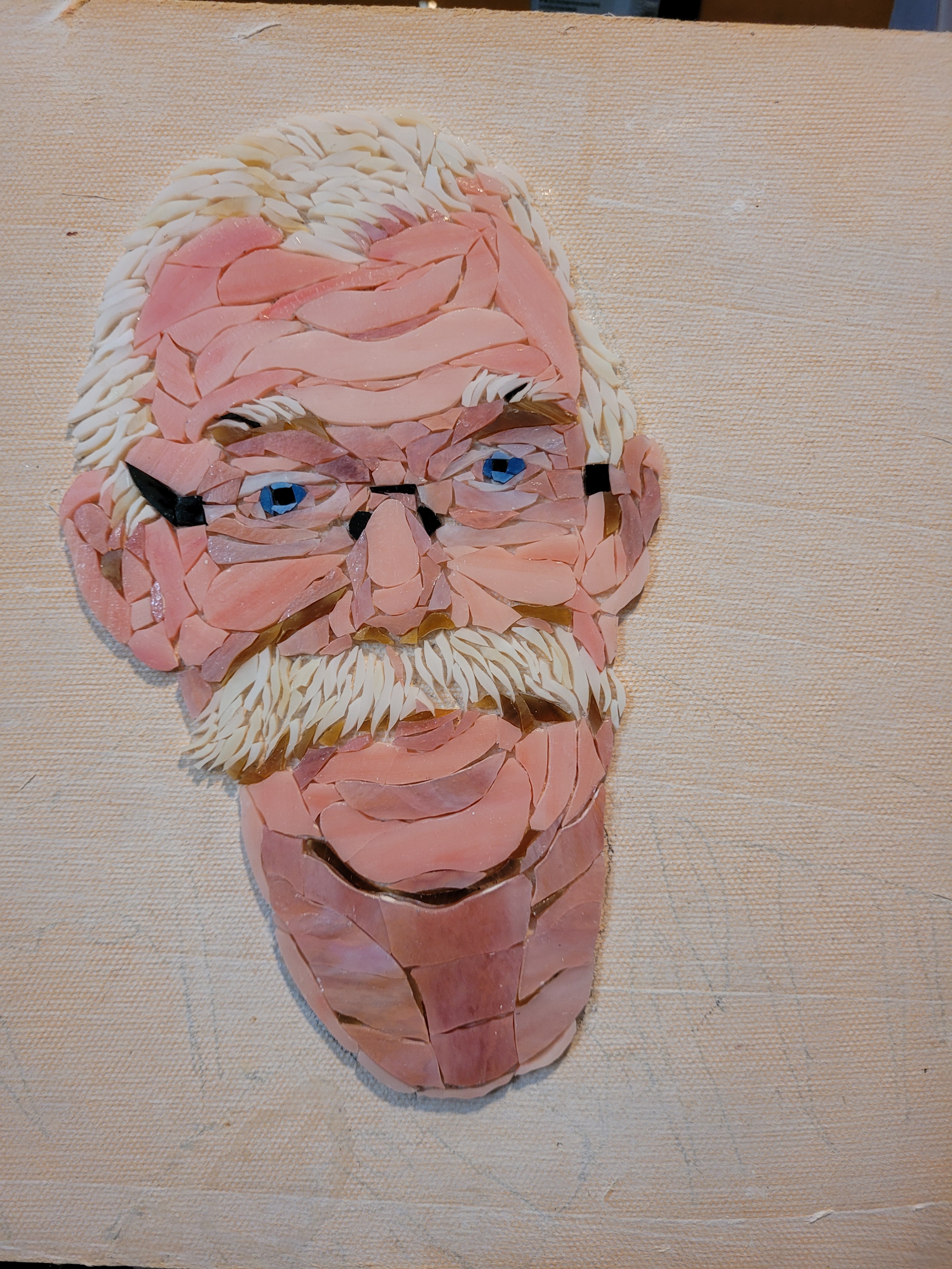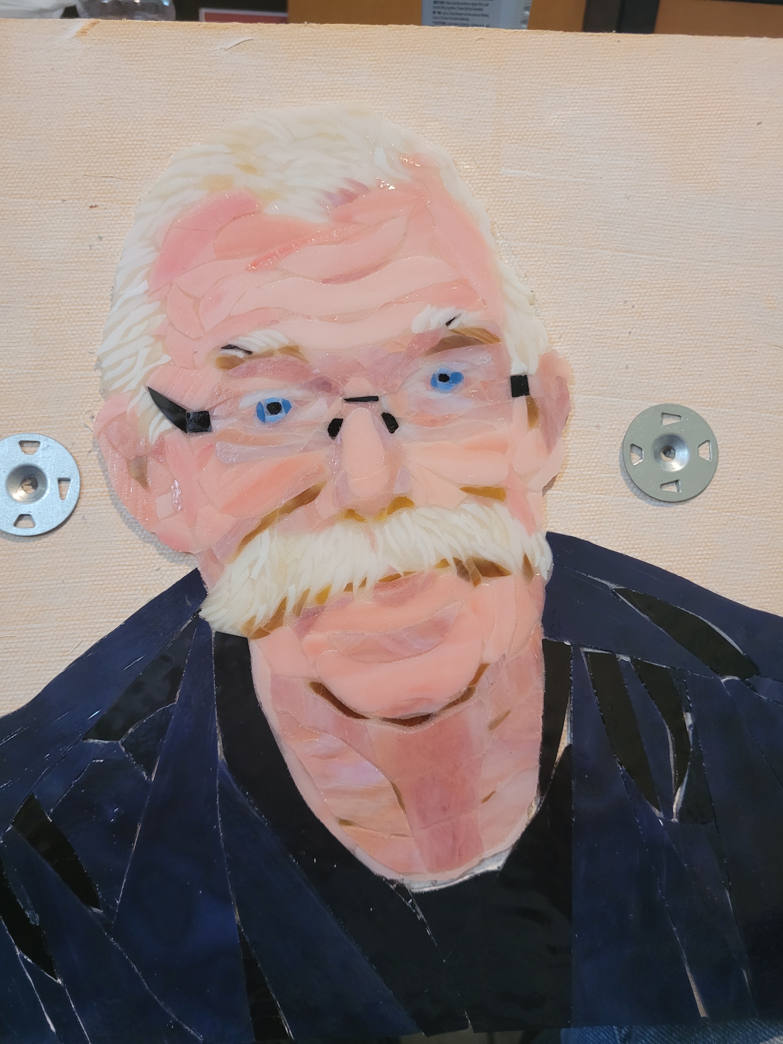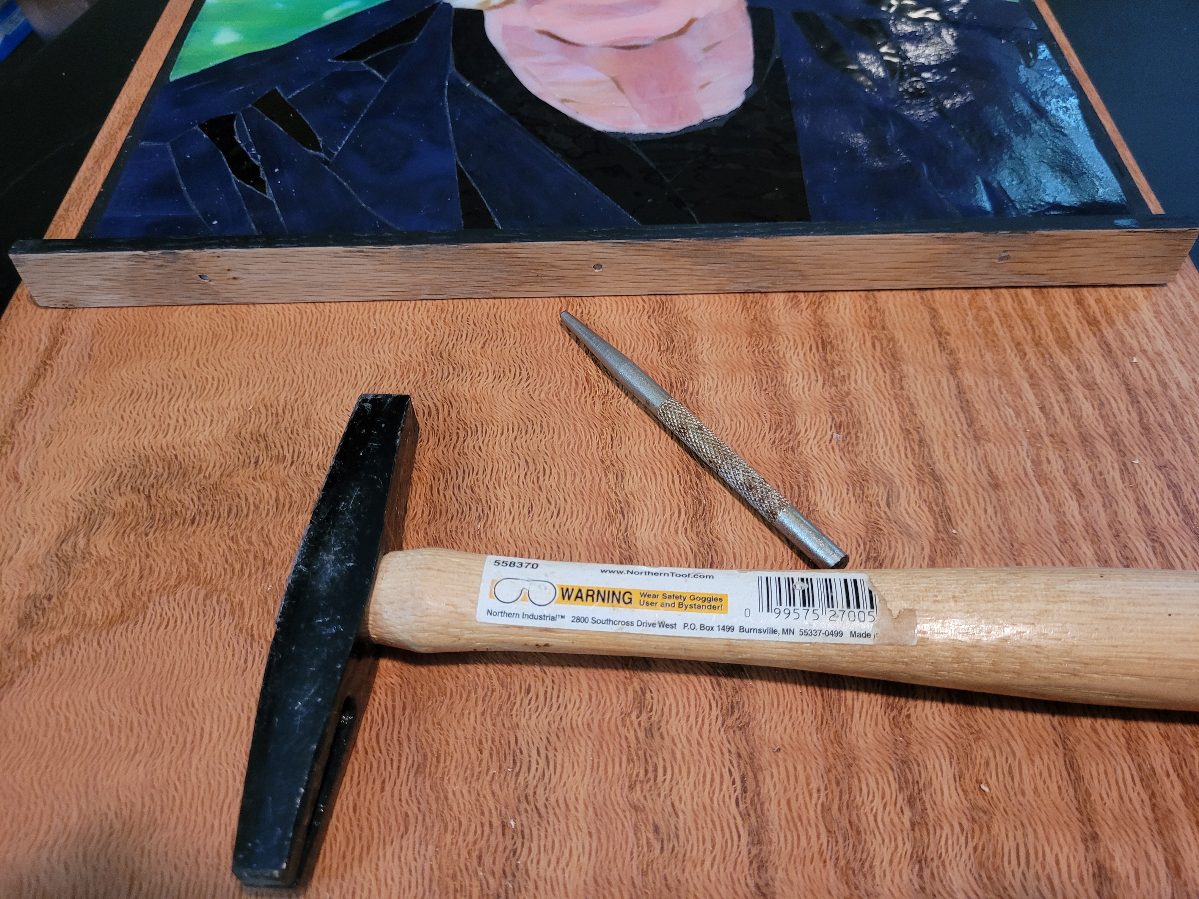 To honor Rusty, I made this mosaic plaque to be displayed at his memorial service at Sundance Orchids. The base is 3/4″ curly red oak, treated with Danish oil to bring out the grain. The mosaic is made from stained glass adhered to Kerdiboard, the stuff they use as tile base in showers and kitchens. Click on each photo for details of its construction.