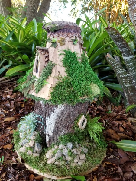Tall cypress knees make the frame for this “fairy house” and two pecky cypress boards are the foundation.